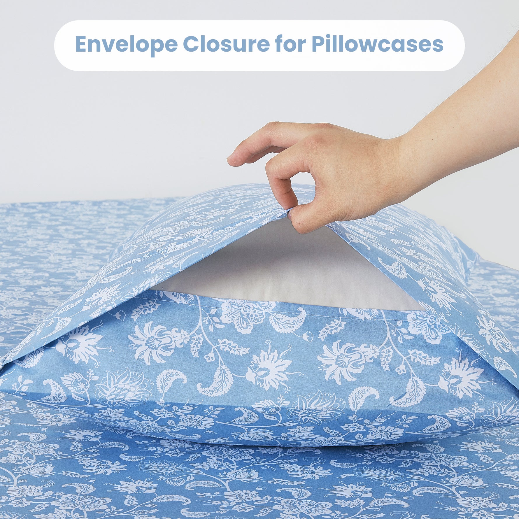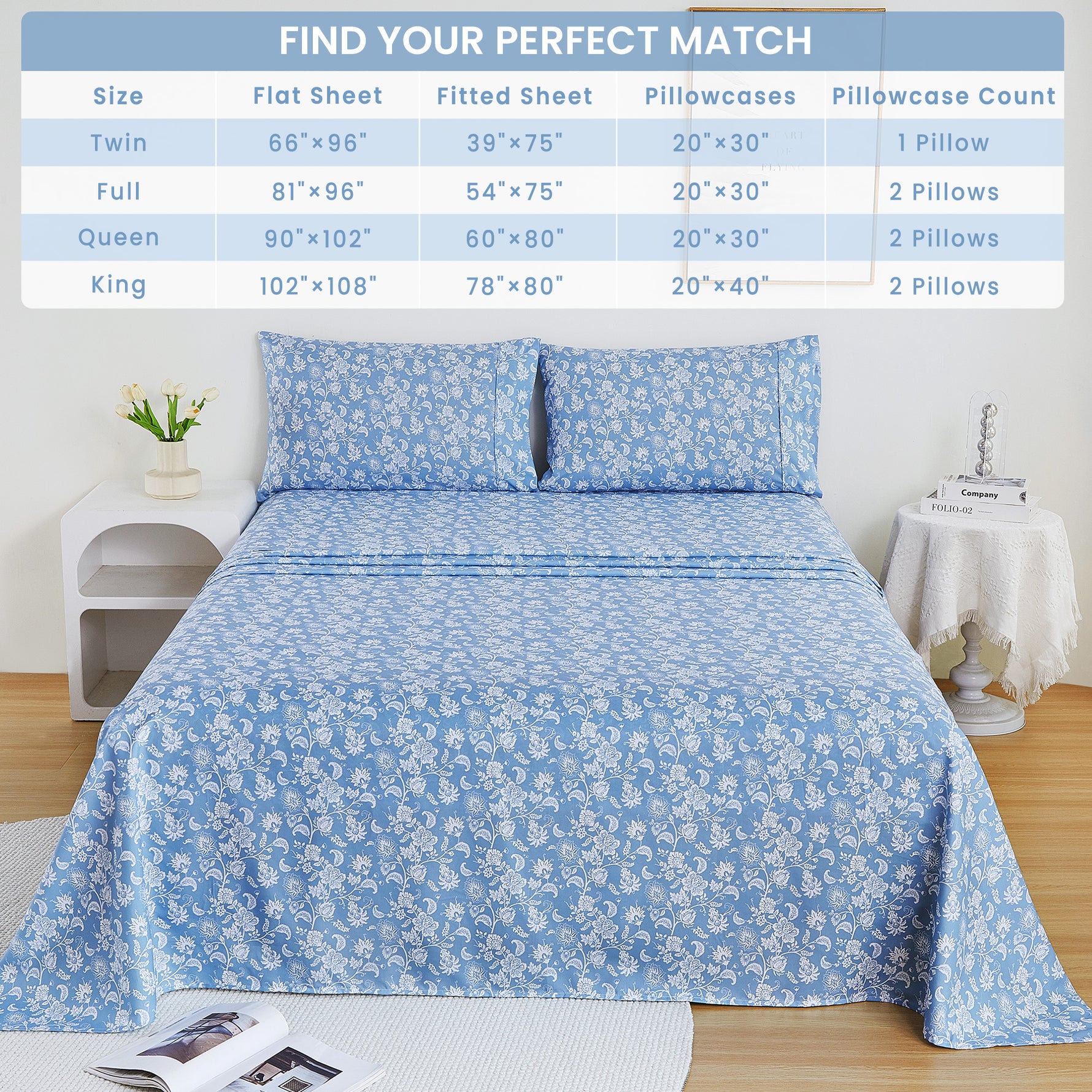 - Juego completo de sábanas Queen Blue Flower Paisley: Nuestro juego de sábanas Queen de 4 piezas con estampado floral vintage incluye 1 sábana ajustable Queen (60" × 80"), 1 sábana plana Queen (90" × 102") y 2 fundas de almohada estándar (20" × 30"), perfectas para camas Queen y dobles.
