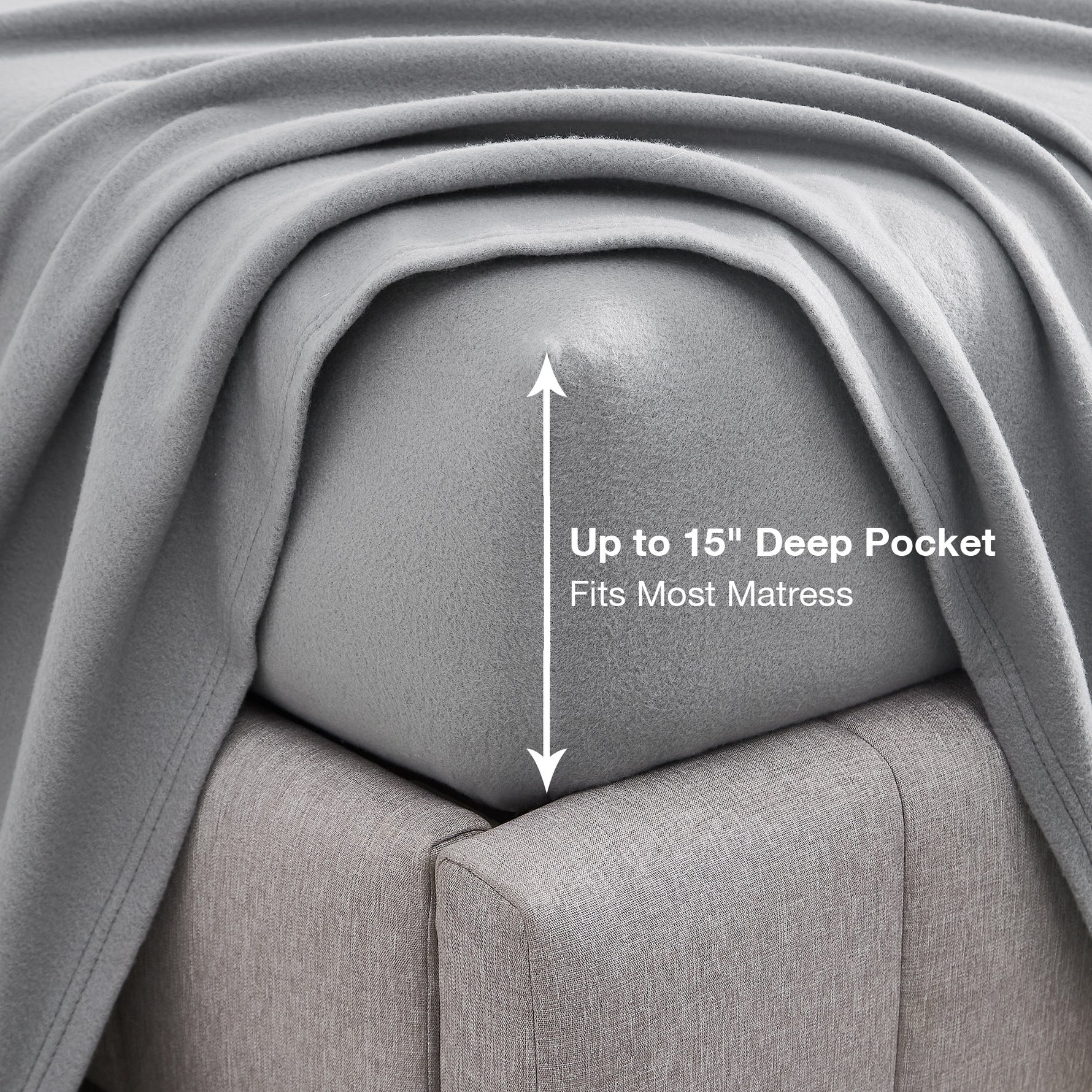 - 4 PCS Fleece Sheet: silver gray queen size polar fleece sheet set include: 4-piece queen size fleece flannel bed sheet set includes 1 queen fleece fitted Sheet: 60"×80" + 15", 1 queen fleece flat sheet: 90"×102" and 2 standard pillowcases: 20"×30" with 4" hem. The winter fleece sheet set includes a 15 inches deep pocket fitted sheet with elastic all around, which not only fit perfectly but they do not lift up on the sides, restful sleep guaranteed
