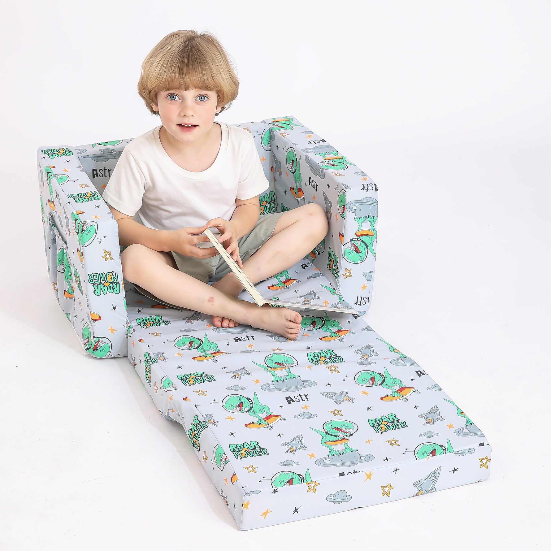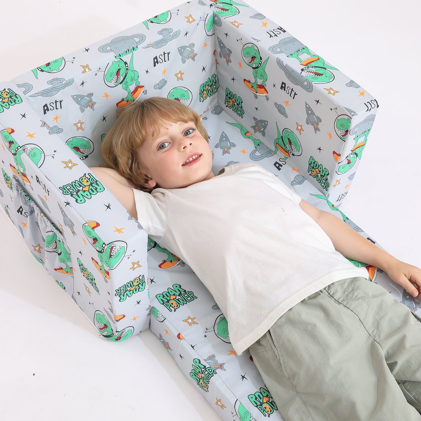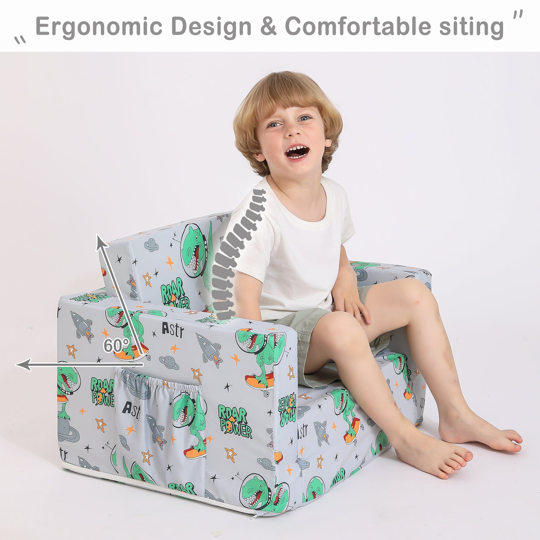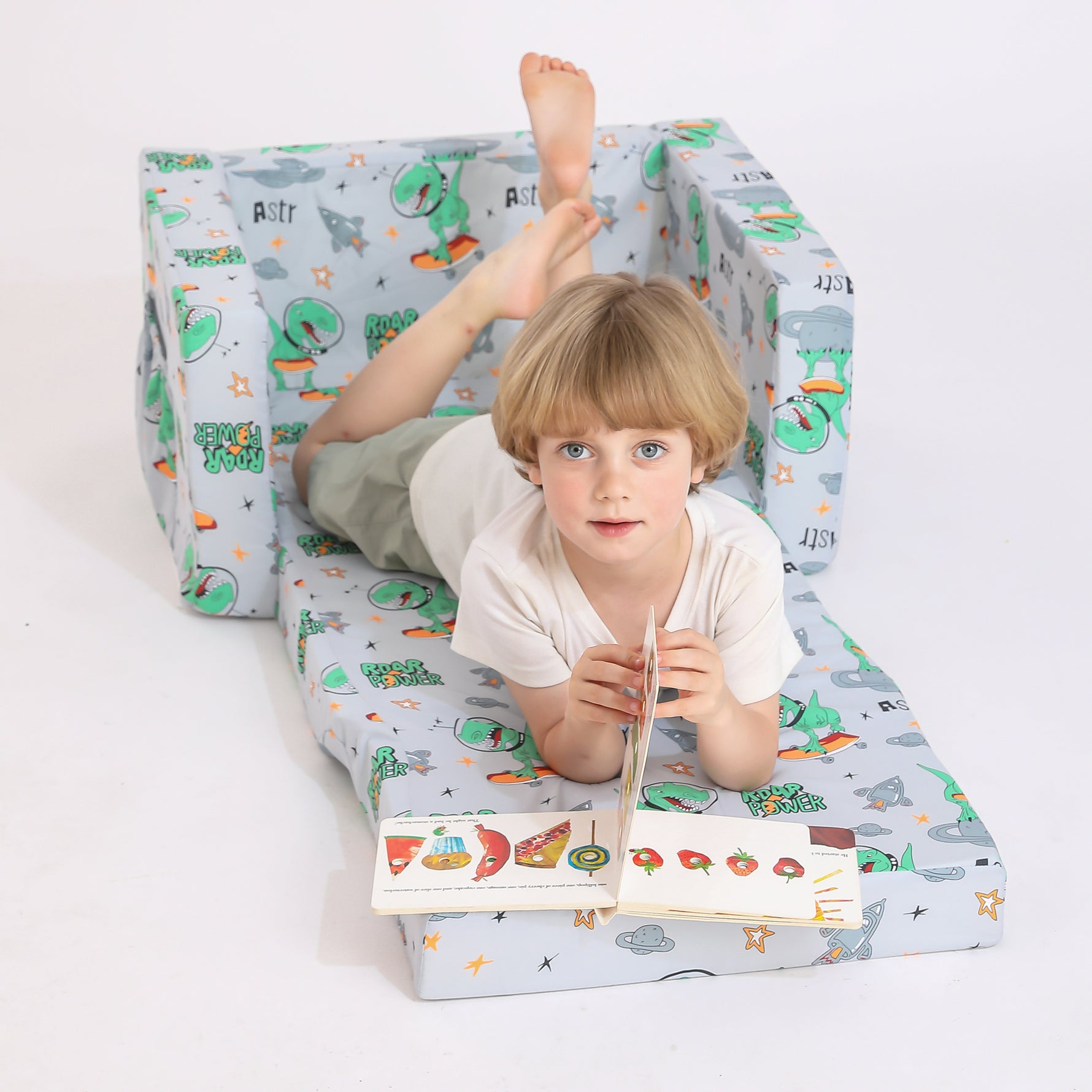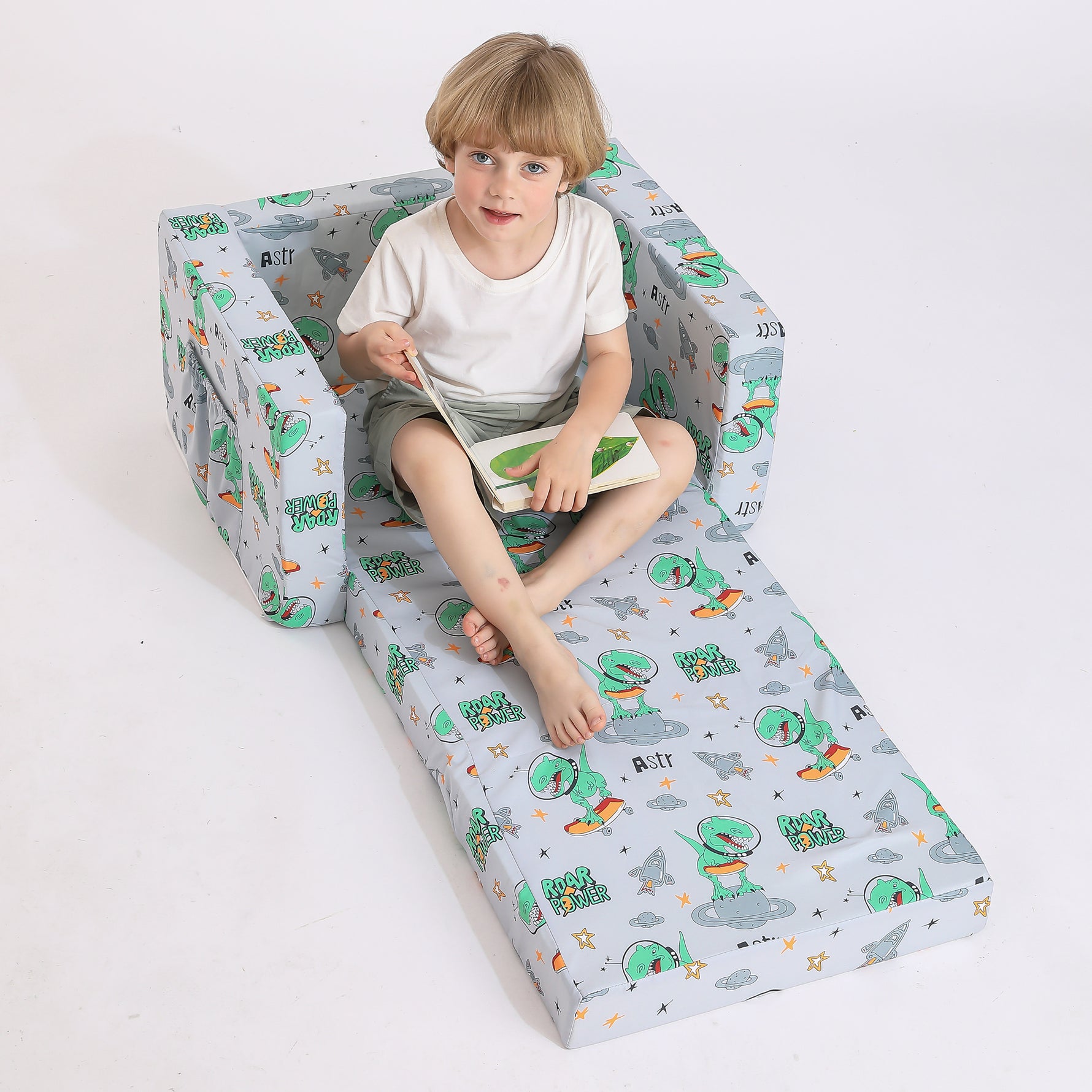Canapé 2 en 1 dinosaure gris pour enfant, convertible en chaise longue