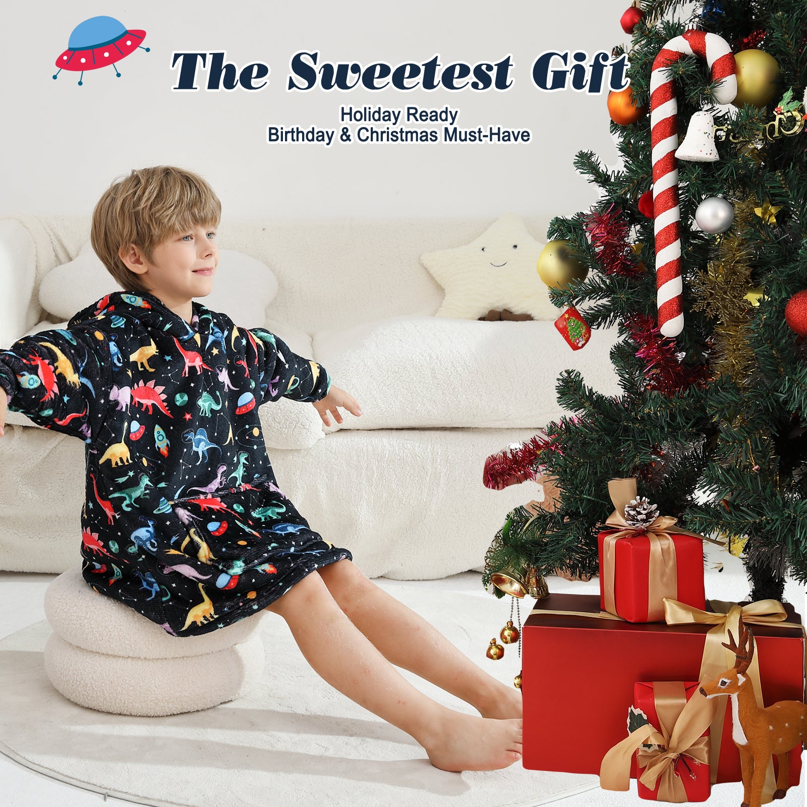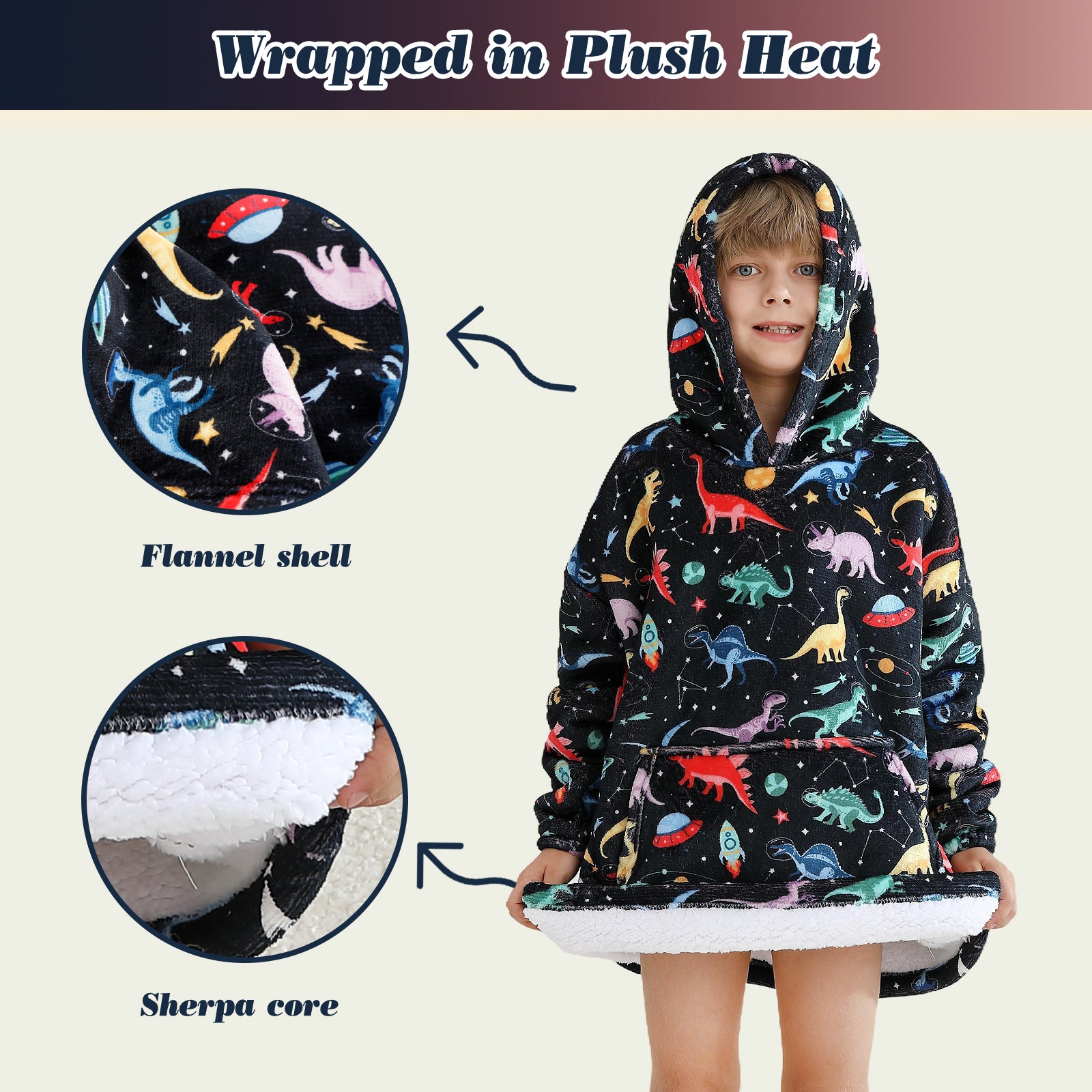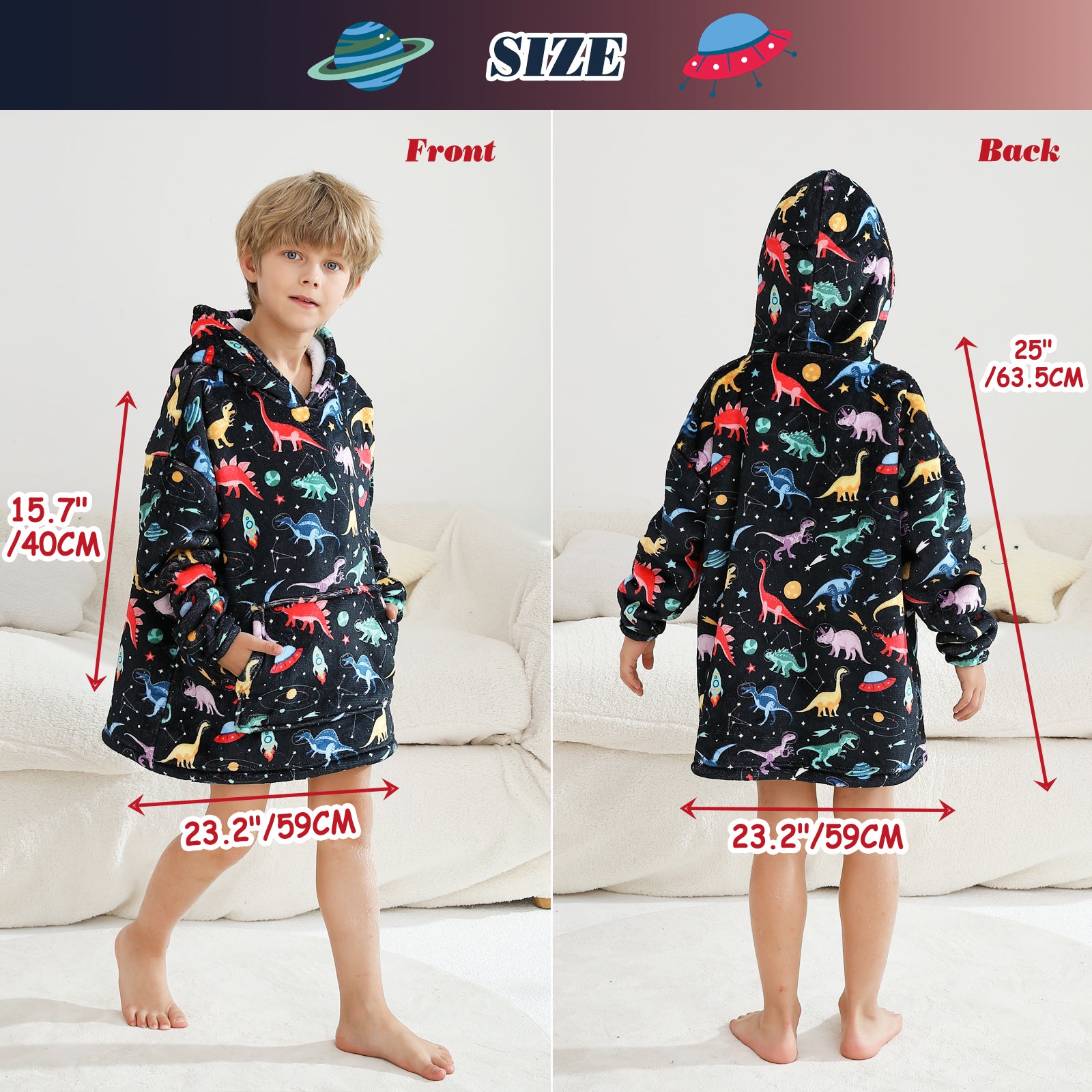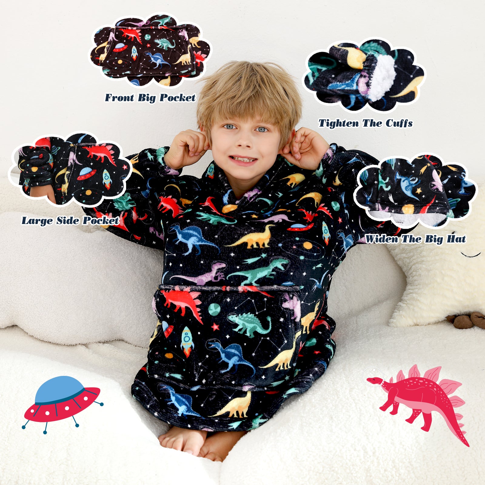 πΏππ£π€ & ππ₯πππ πΌππ«ππ£π©πͺπ§π πΏππ¨πππ£ : This wearable blanket hoodie for kids blasts into a cosmic - dino playground! Β A deep navy base is packed with vibrant dinosaurs, stars, galaxies, retro rockets, planets, and comets. Β Little ones aged 2 - 6 will love spotting dinos exploring the universe, whether snuggling or pretend - playing as astronaut - paleontologists. Β It turns every day into an epic dino - space collision adventure.