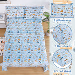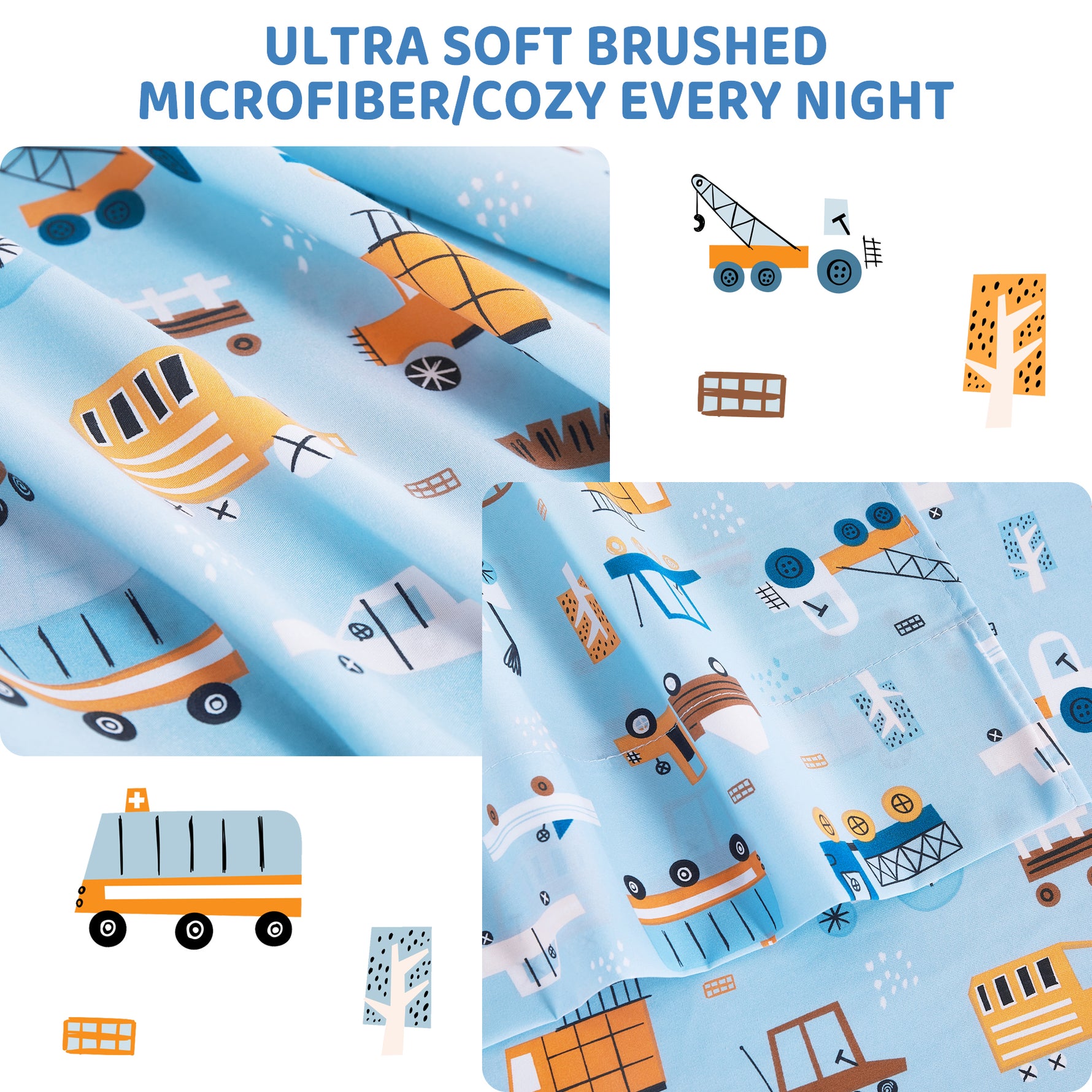 Twin Size Sheet Set: 3-piece kids twin sheet set includes 1 flat sheet 66"×96", 1 fitted sheet 39"×75" with a 15 inches deep pocket and 1 pillowcase 20"×30". 15 inches deep-pocket fitted sheet with elastic all around - make sure this kids sheet and pillowcase set fits well with kid's twin single bed