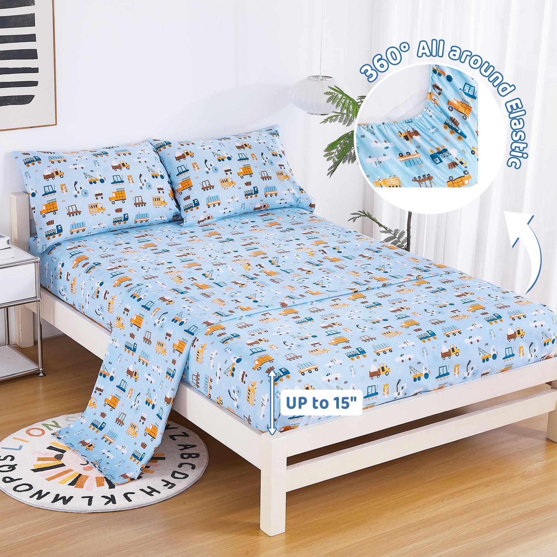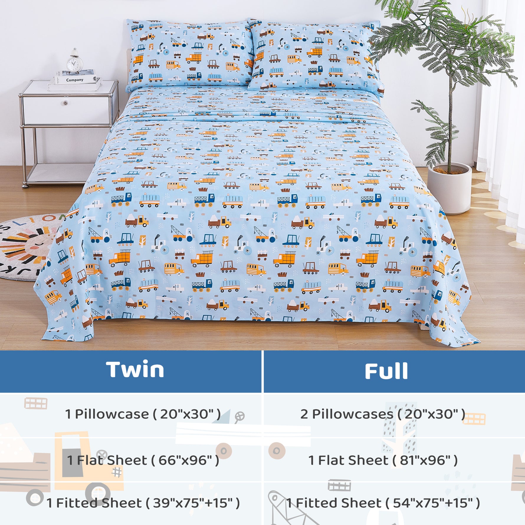 Full Size Sheet Set: 4-piece kids full sheet set includes 1 flat sheet 81"×96", 1 fitted sheet 54"×75" with a 14 inches deep pocket and 2 pillowcases 20"×30". 14 inches Deep-pocket fitted sheet with elastic all around-make sure this kids sheet and pillowcase set fits well