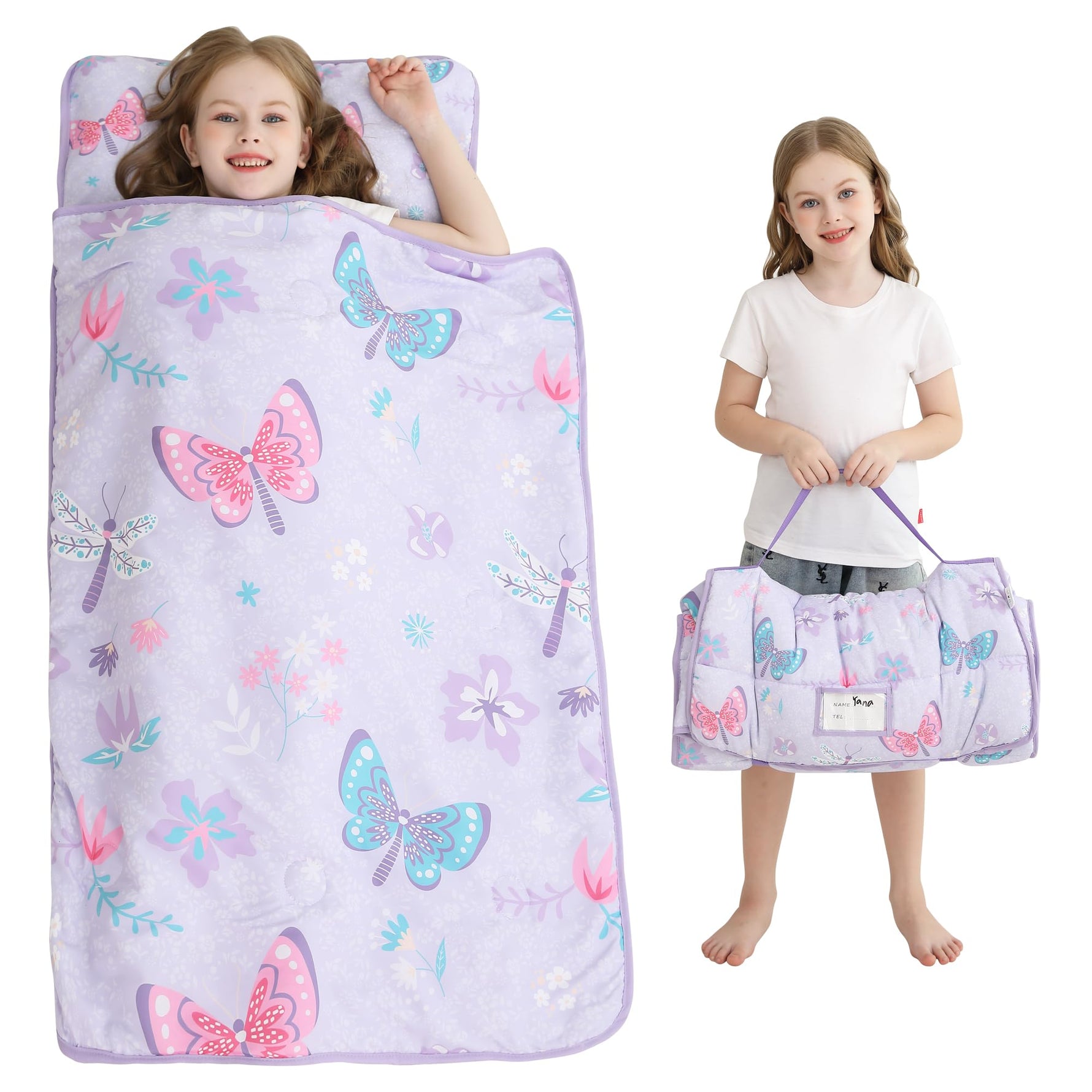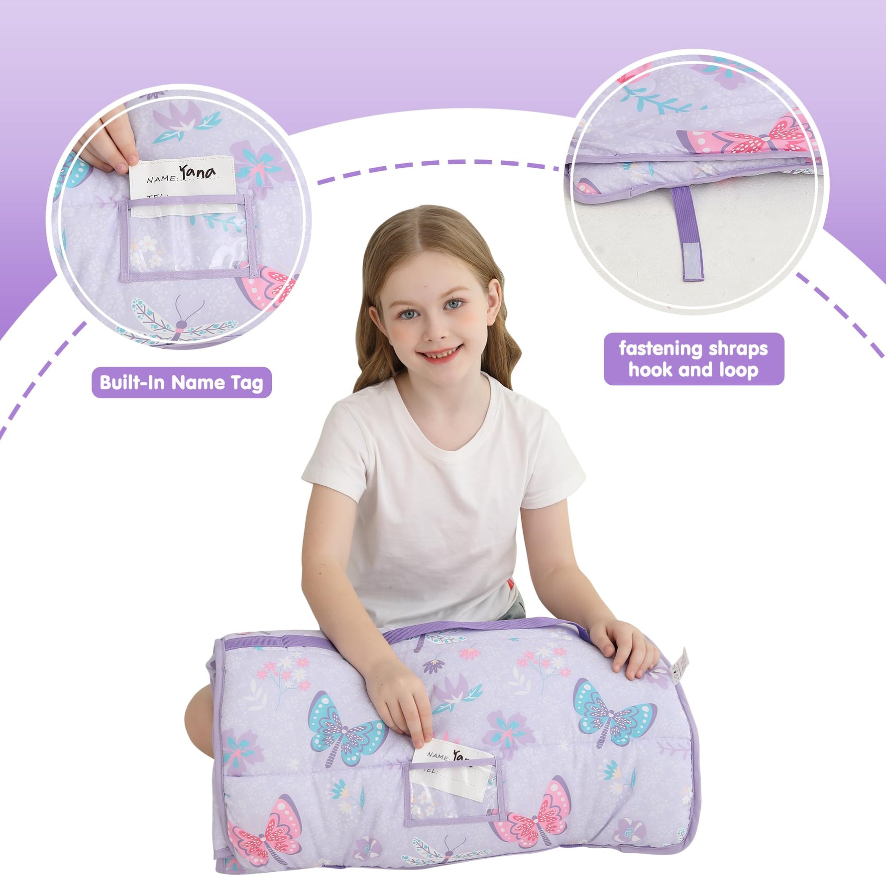 - Versatile and Fun: Girls purple butterfly slumber bag perfect for preschool nap time, daycare, kindergarten, sleepovers, camping, and other outdoor adventures- this multi-role nap mat/sleeping bag is loved by toddlers kids everywhere
