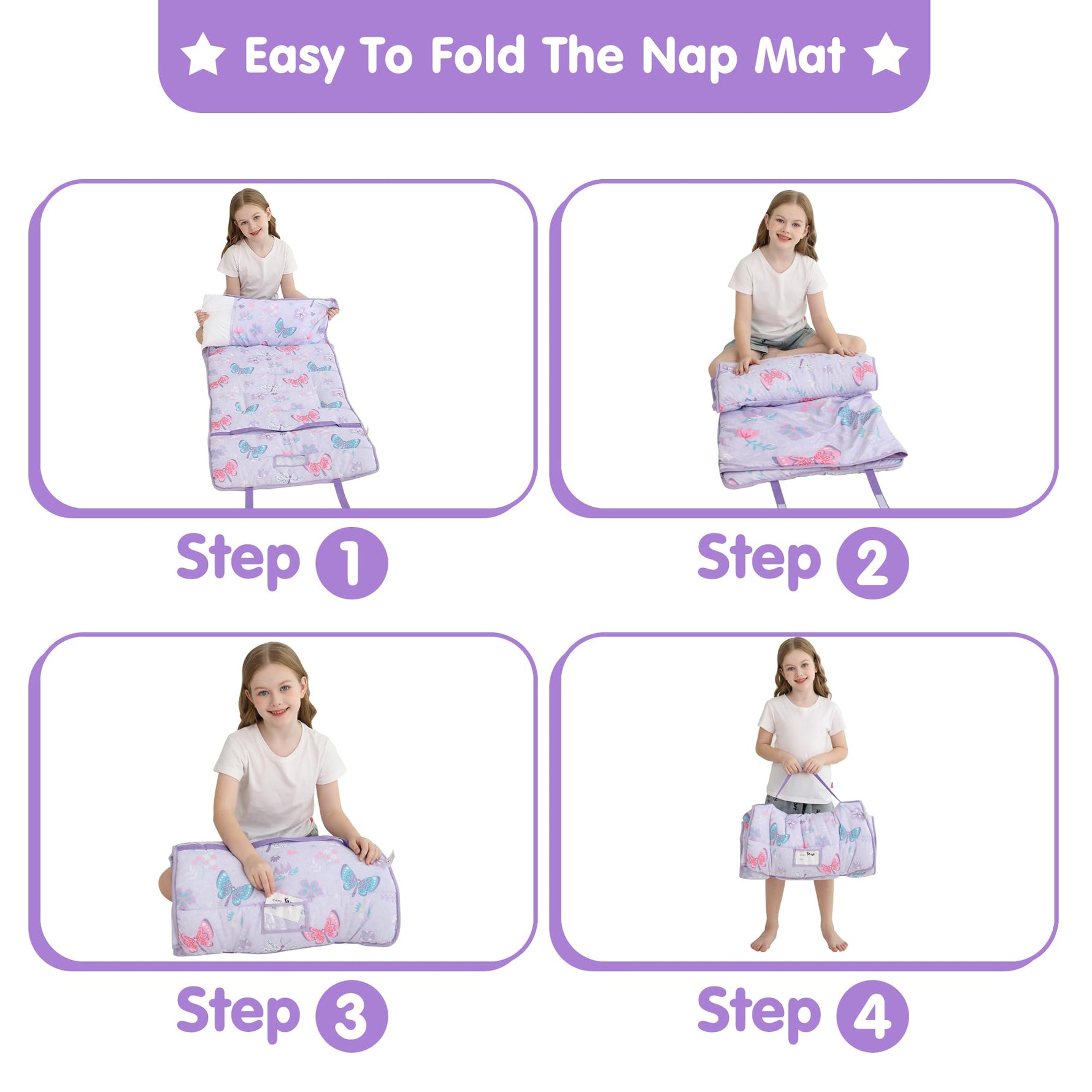 - The Right Size: Sized at 50"*20" with a 41"*32" blanket, this girls purple butterfly kindergarten nap mat/ slumber bag with a removable pillow and blanket is ideal for kids aged 3-6, ensuring a comfortable and snug fit