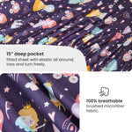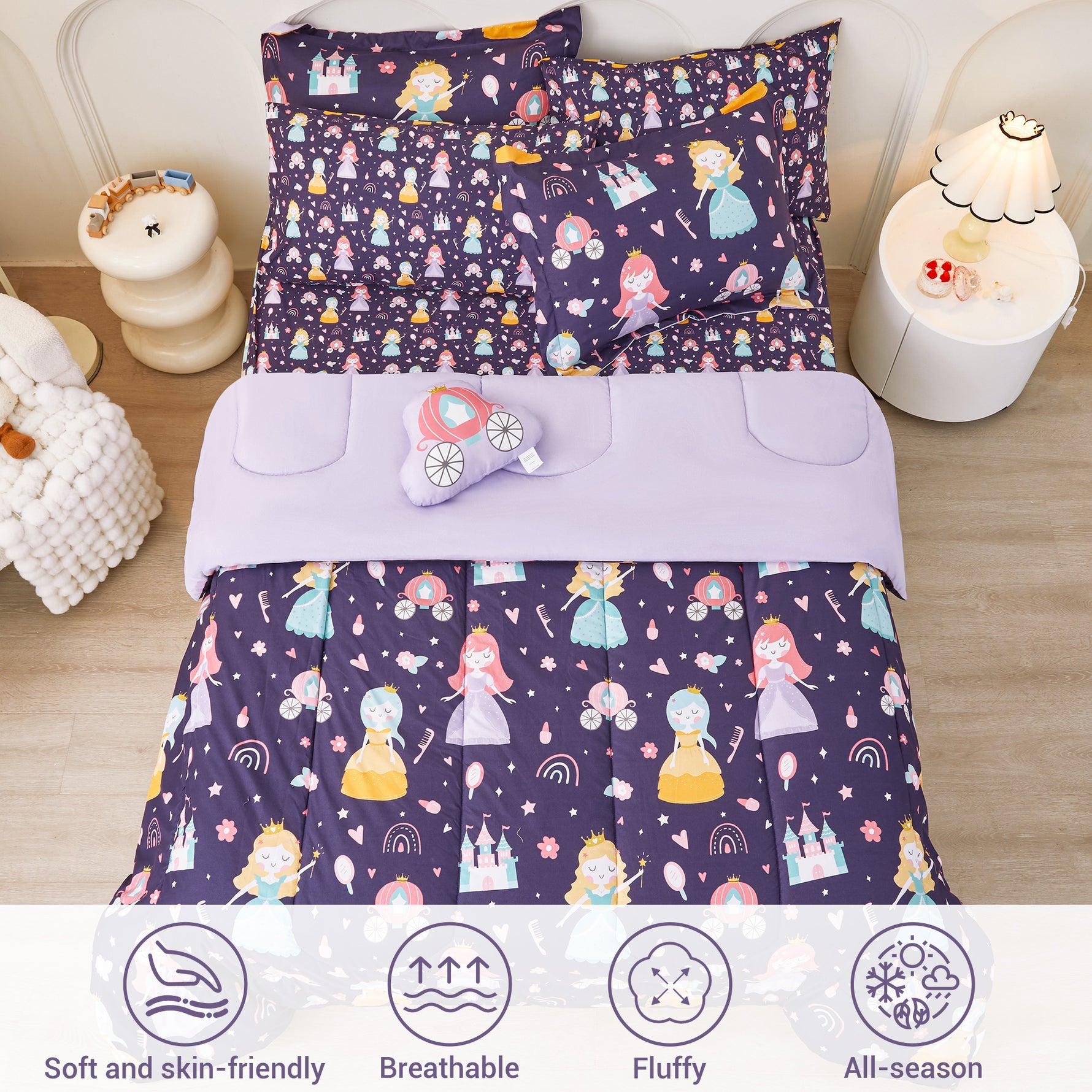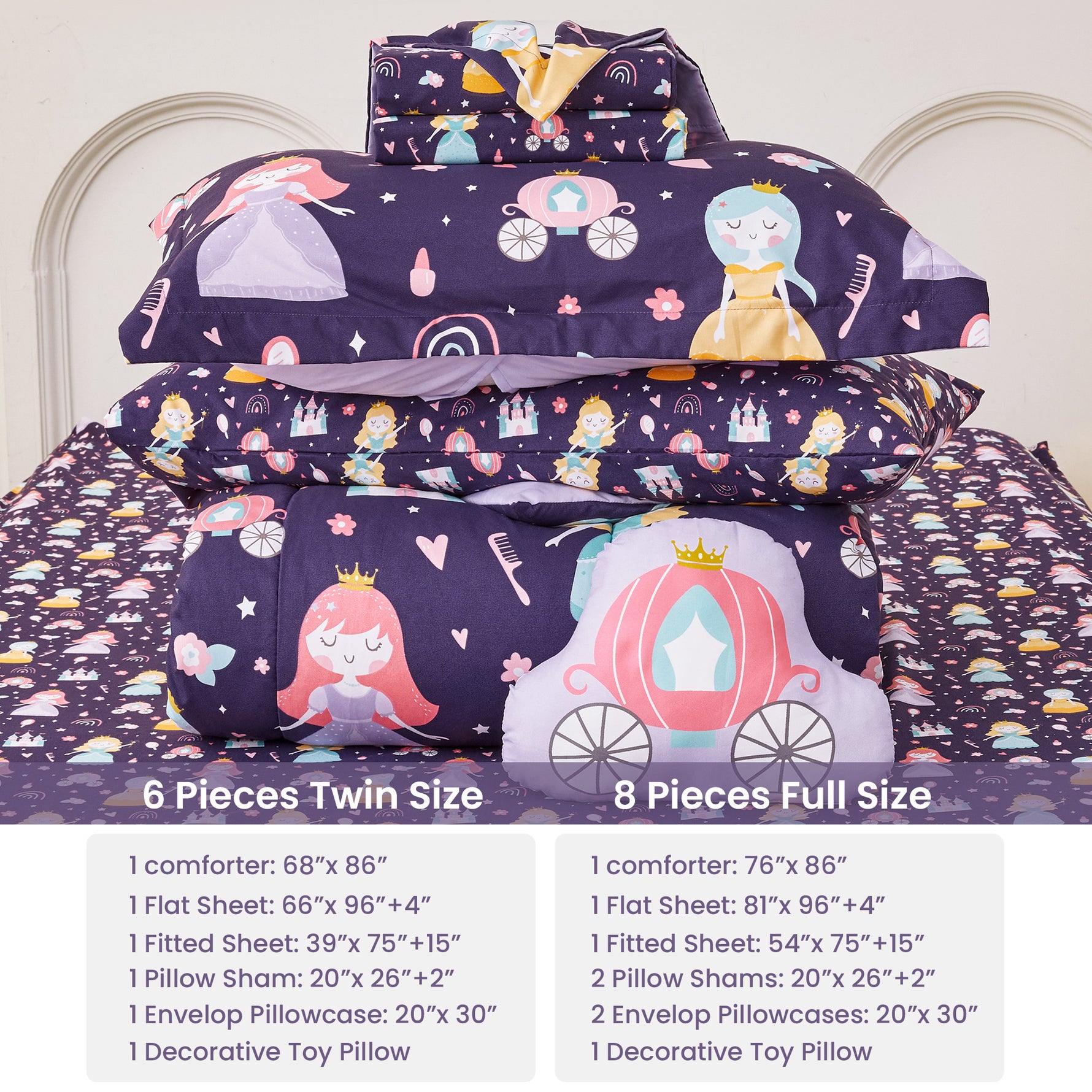 - 6 Pcs Girls Twin Bedding Set: Includes 1 comforter (68"x86"), 1 flat sheet (66"x96"+4"), 1 fitted sheet (39"x75"+15"), 1 envelop pillowcase (20"x30"), 1 pillow sham (20"x26"+2") and 1 decorative toy pillow.