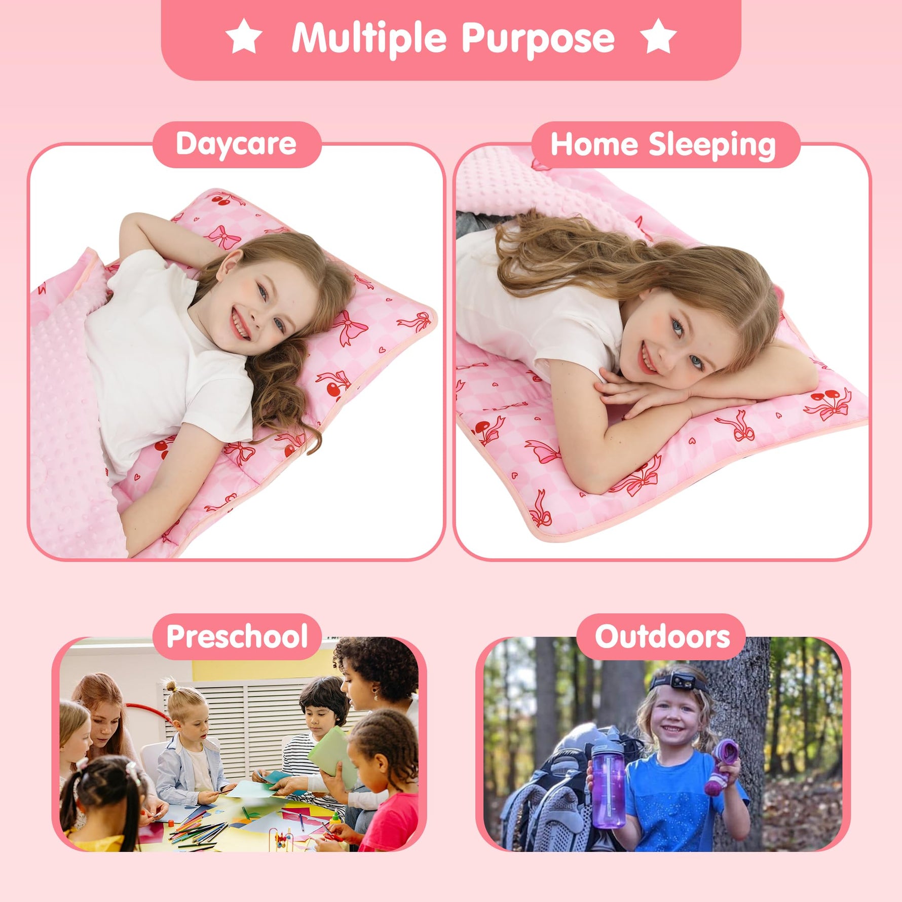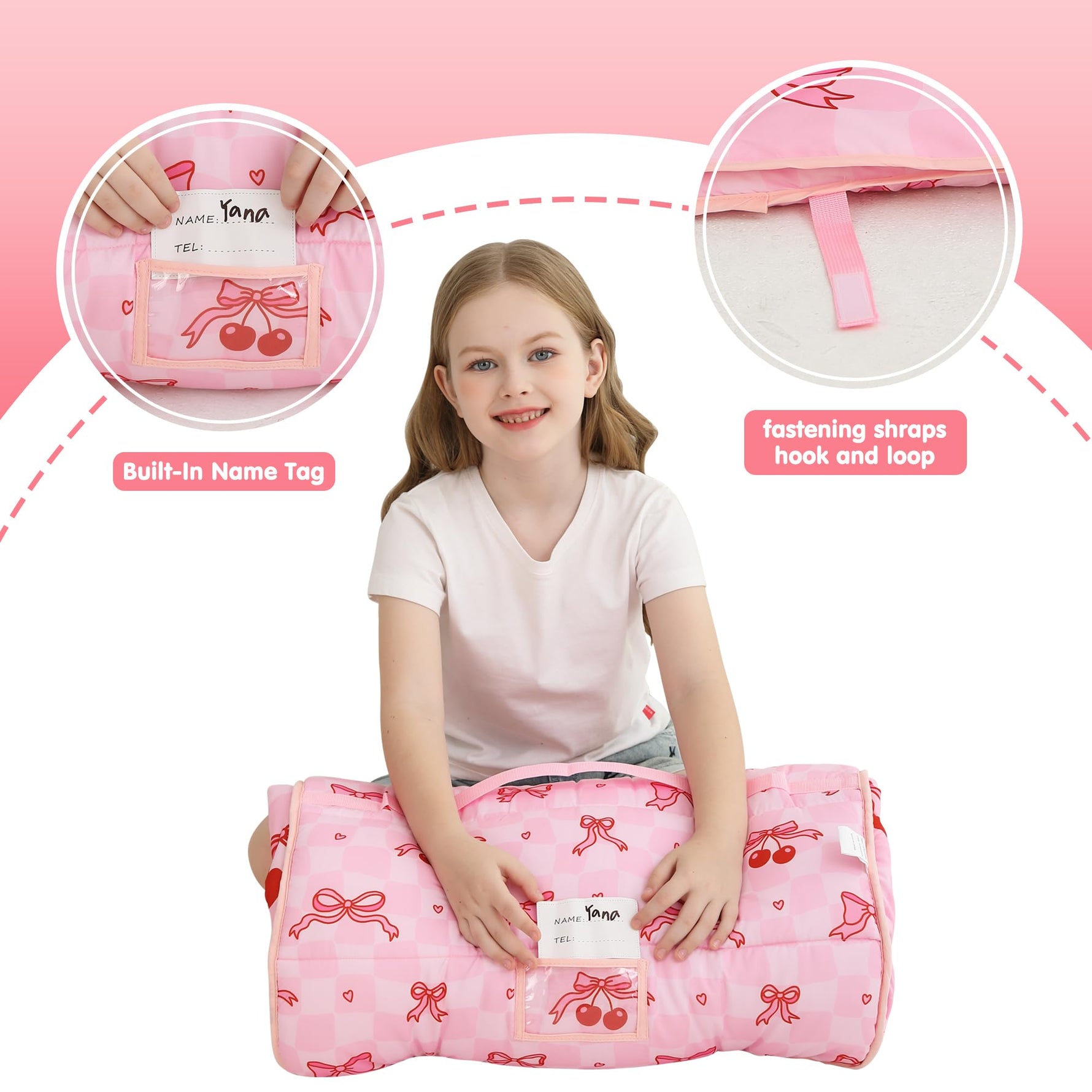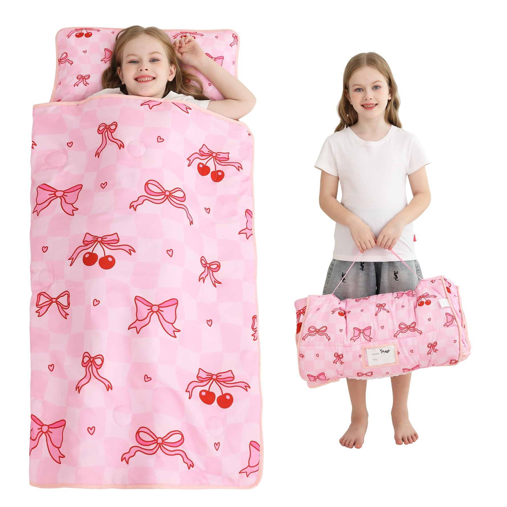 - Versatile and Fun: Girls pink cherry slumber bag Perfect for preschool nap time, daycare, kindergarten, sleepovers, camping, and other outdoor adventures- this multi-role nap mat/sleeping bag is loved by toddlers kids everywhere