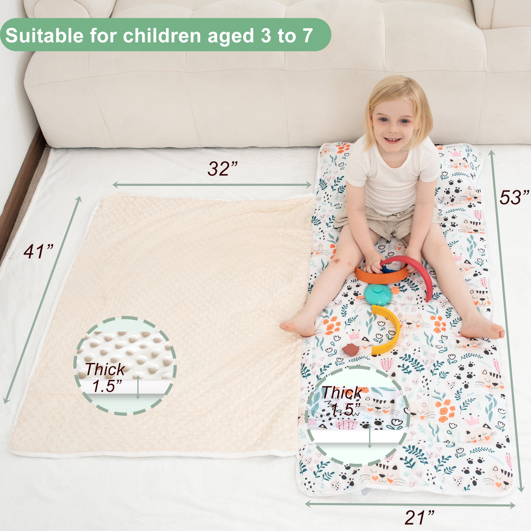 - Extra-Large and Thick:Mat finished size (including pillow): 50 "x 21 "x 2 ", blanket finished size: 41 " x 32 ". It is a perfect size designed for children ages 3 plus