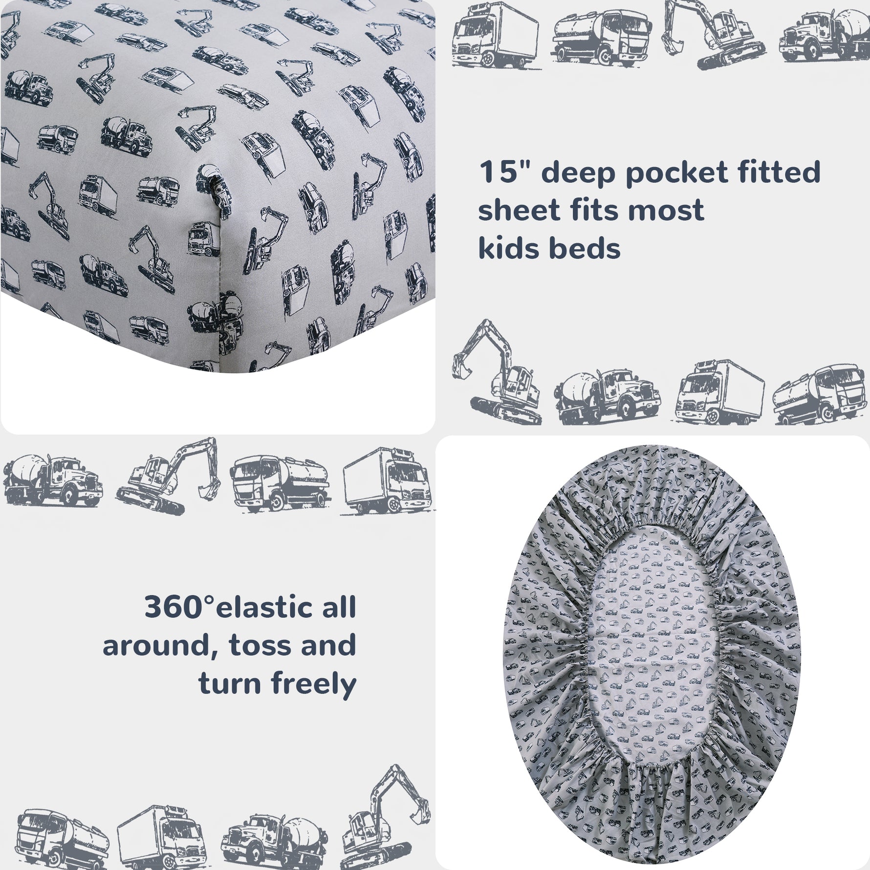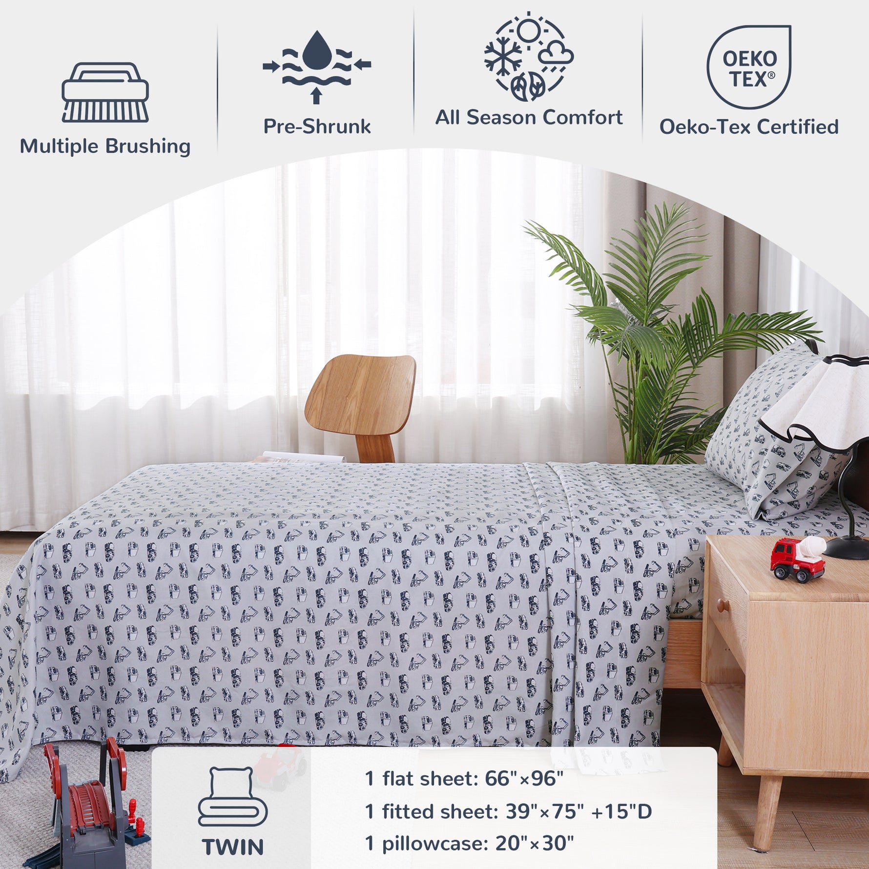 【Twin Size】3-piece fire engin sheets twin includes 1 flat sheet 66"×96" with a 4" self-hem, 1 fitted sheet 39"×75" with a 12 inches deep pocket and 1 pillowcase 20"×30" each with a 4" hem. 12 inches Deep-pocket fitted sheet with elastic all around.