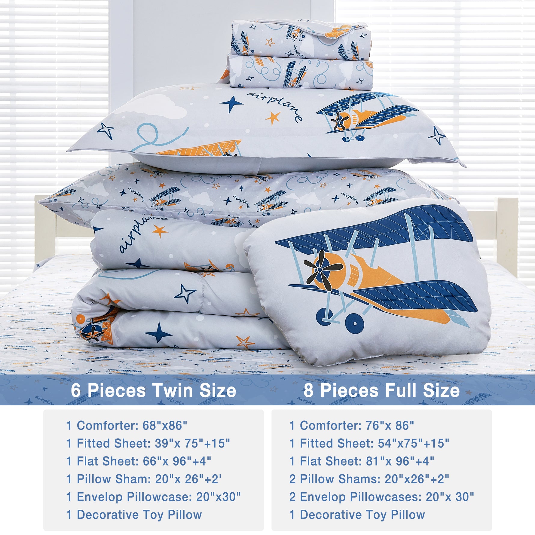 - 6 Pcs Girls Twin Bedding Set: Includes 1 comforter (68"x86"), 1 flat sheet (66"x96"+4"), 1 fitted sheet (39"x75"+15"), 1 envelop pillowcase (20"x30"), 1 pillow sham (20"x26"+2") and 1 decorative toy pillow.