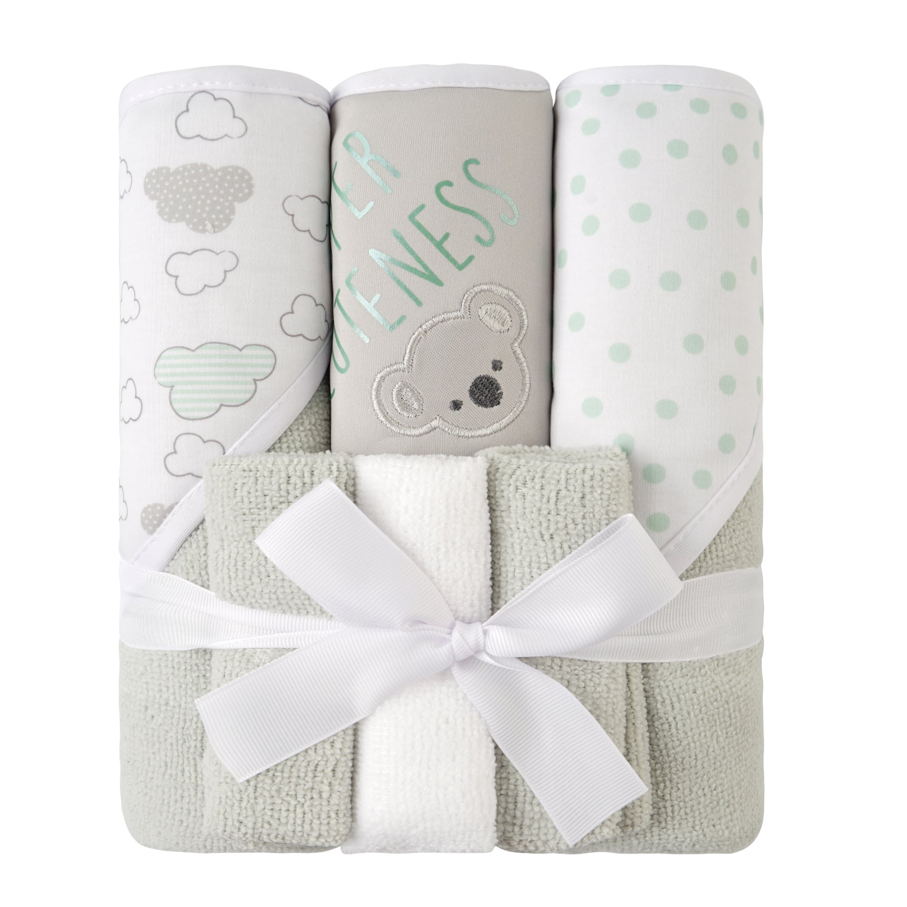 Six-piece set featuring three washcloths, three hooded towels, Washcloths: 9" x 9"; Towels: 28" x 28"; Knit binding, jersey-lined hoods. The ultra-soft and highly absorbent material gives a comfortable and soft experience that any infant would appreciate