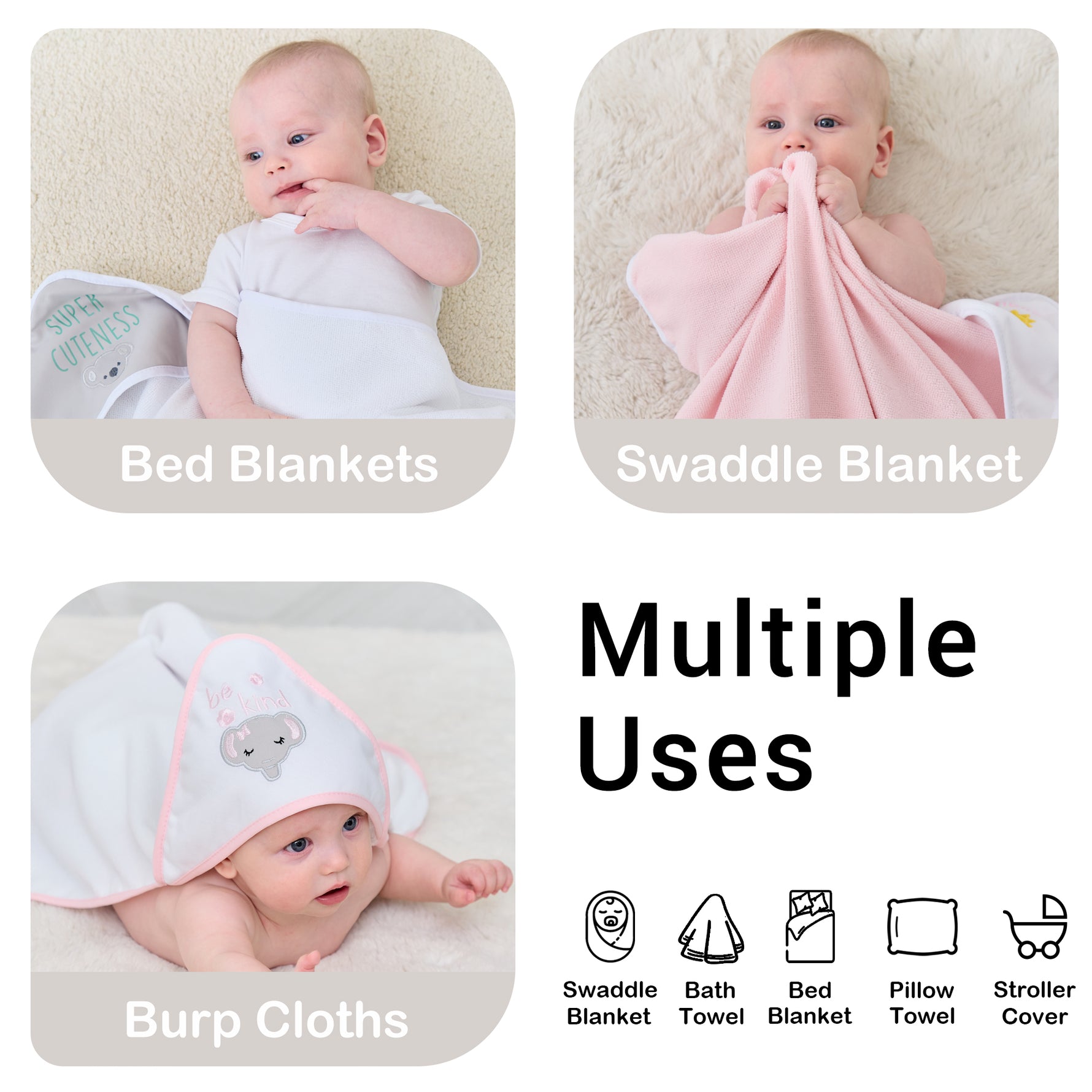 VERSATILE Use: From newborns to toddlers, these Hooded Baby Towels are generously sized to accommodate babies of all ages, making them the perfect choice for your child's bath time routine.Multipurpose Baby items: this set can be as baby towels, baby wipes, dribble cloths, bibs, hand towels, feeding towels, and various kitchen or cleaning clothes; These infant hooded towels and wash cloths can handle whatever baby related mess you throw at them, making it a versatile choice for every parent