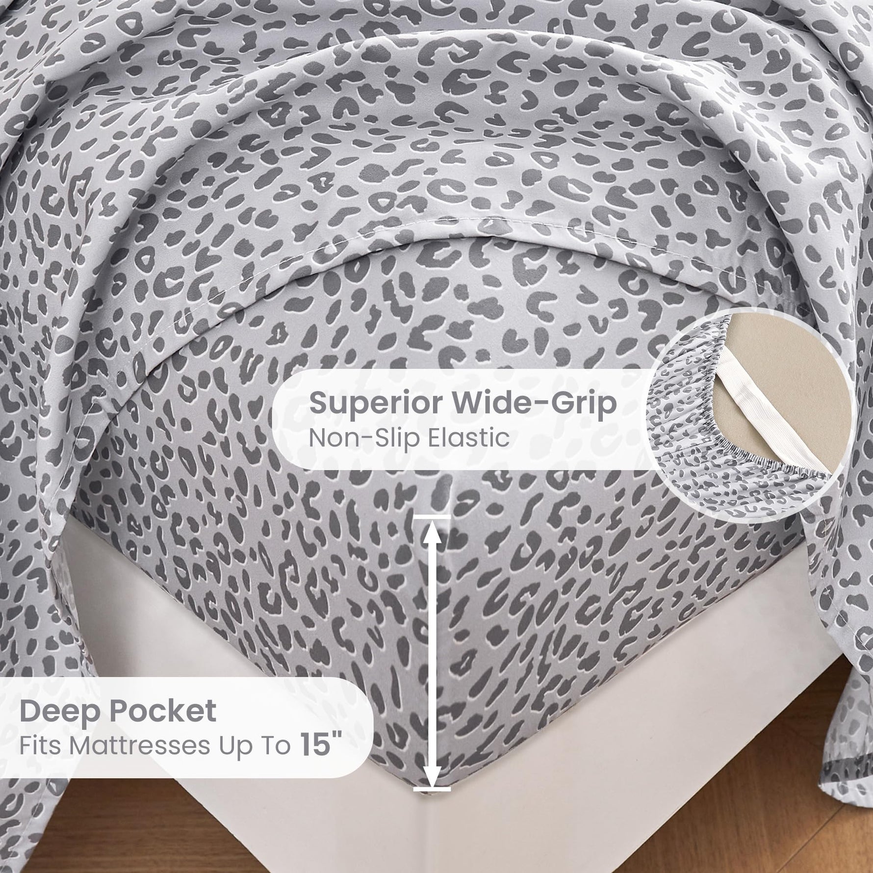 - 15” deep pocket NON-SLIP fitted sheets have extra corner straps for animal print bedsheet sets.