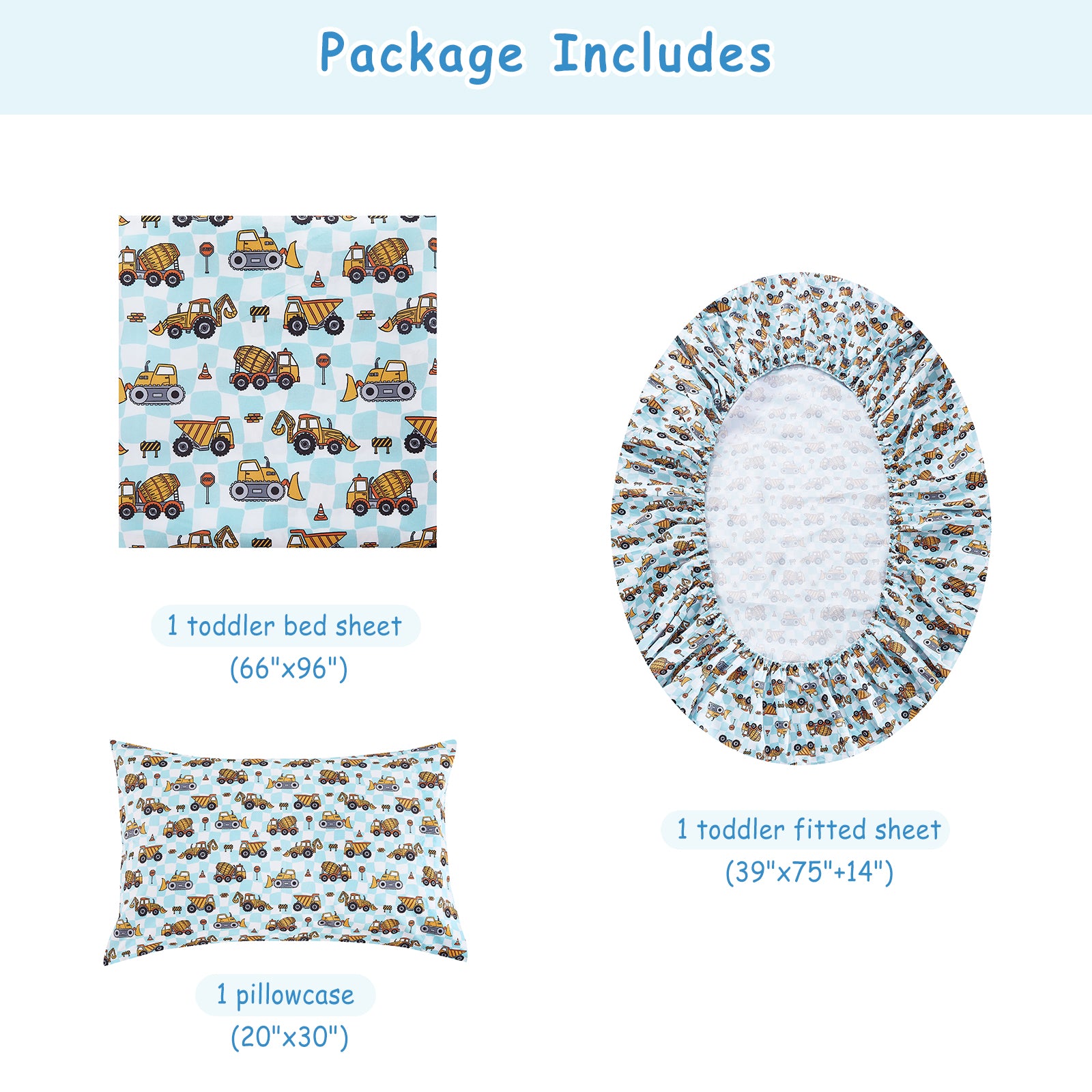 Twin Size Sheet Set: 3-piece kids twin sheet set includes 1 flat sheet 66"×96", 1 fitted sheet 39"×75" with a 15 inches deep pocket and 1 pillowcase 20"×30". 15 inches deep-pocket fitted sheet with elastic all around - make sure this kids sheet and pillowcase set fits well with kid's twin single bed.