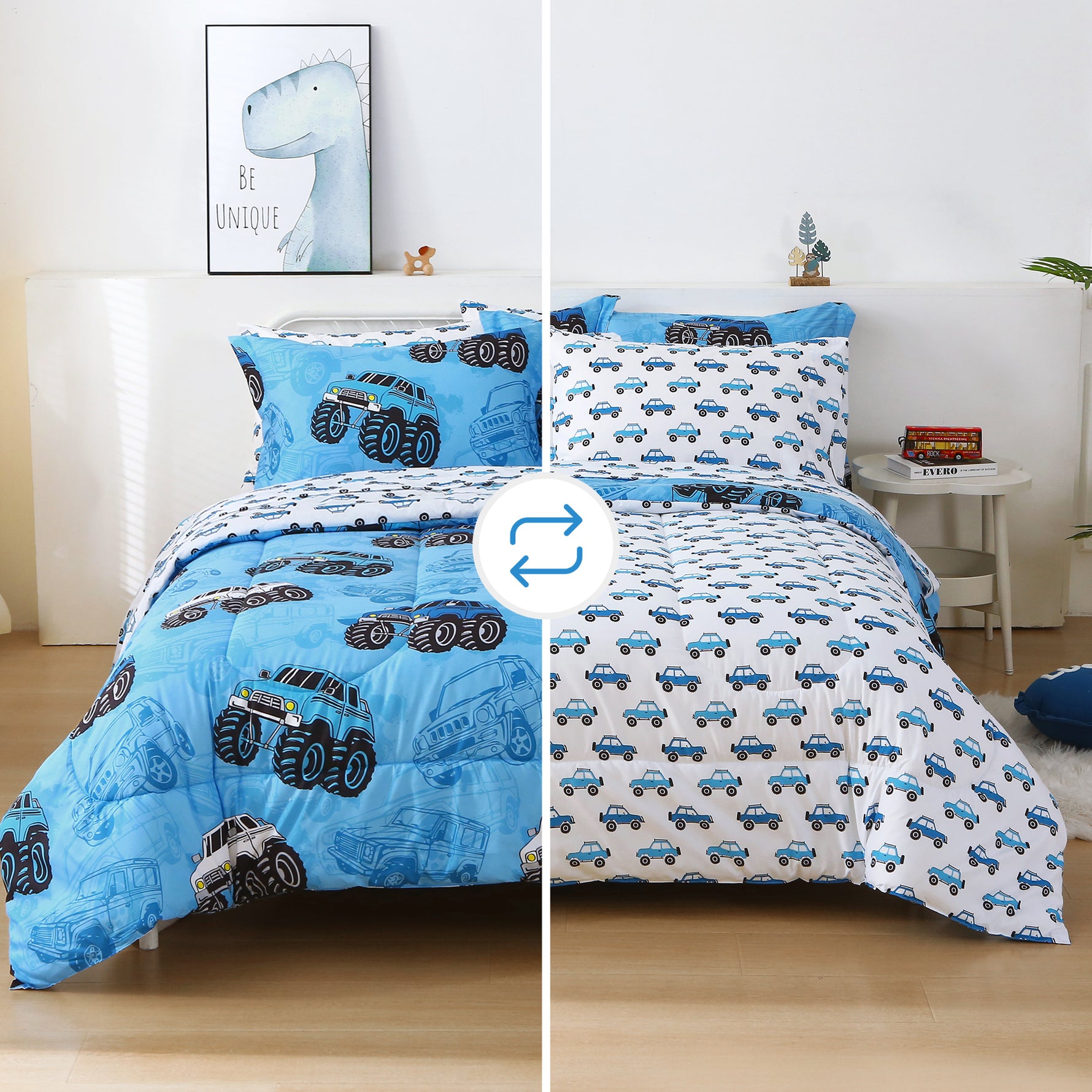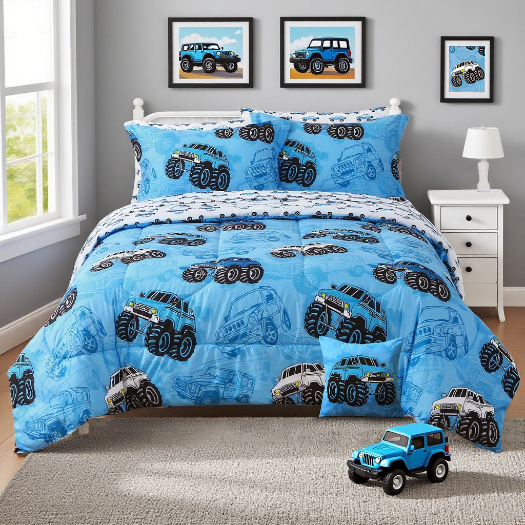 - BEDDING ROOM DECOR: boys bed set is designed with a pattern of Jeep car, which brings much fun to this comforter set. The bedding set is great for boys to decorate bedrooms and a great gift for kids toddler friends on birthday, Christmas and other festivals. Espeacially the matched jeep throw pillow will add a touch of color to children's room