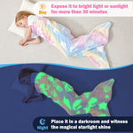 - 【Glow Mermaid Tail Blanket】: Our mermaid tail blanket glows in the dark. Simply expose the Blanket to bright light for at least 15 minutes, then turn off the lights. The longer the blanket is exposed to sunlight or light the brighter it will be in the dark!