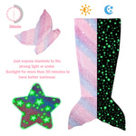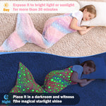 - 【Glow Mermaid Tail Blanket】: Our mermaid tail blanket glows in the dark. Simply expose the Blanket to bright light for at least 15 minutes, then turn off the lights. The longer the blanket is exposed to sunlight or light the brighter it will be in the dark!