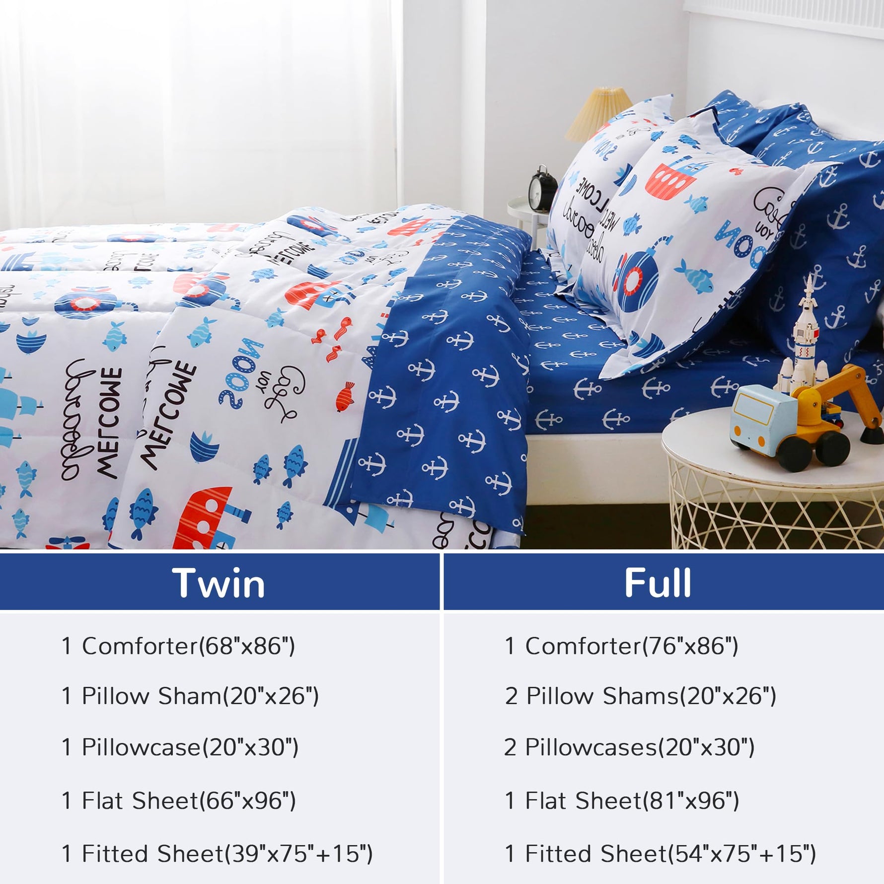Unit price perPerfect for Kids: Our twin bedding sets include a soft 1 comforter (68"x86"), 1 flat sheet (66"x96"), 1 fitted sheet (39"x75"+15"), 1 pillowcase (20"x30") and 1 pillow sham (20"x26") – 5 pieces twin comforter set with sheets for girls.Our full bedding sets include a soft 1 comforter (76"x86"), 1 flat sheet (81"x96"), 1 fitted sheet (54"x75"+15"), 2 pillowcases (20"x30") and 2 pillow shams (20"x26"+2") – 7 pieces full comforter set with sheets for girls