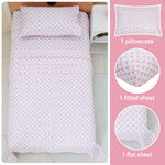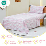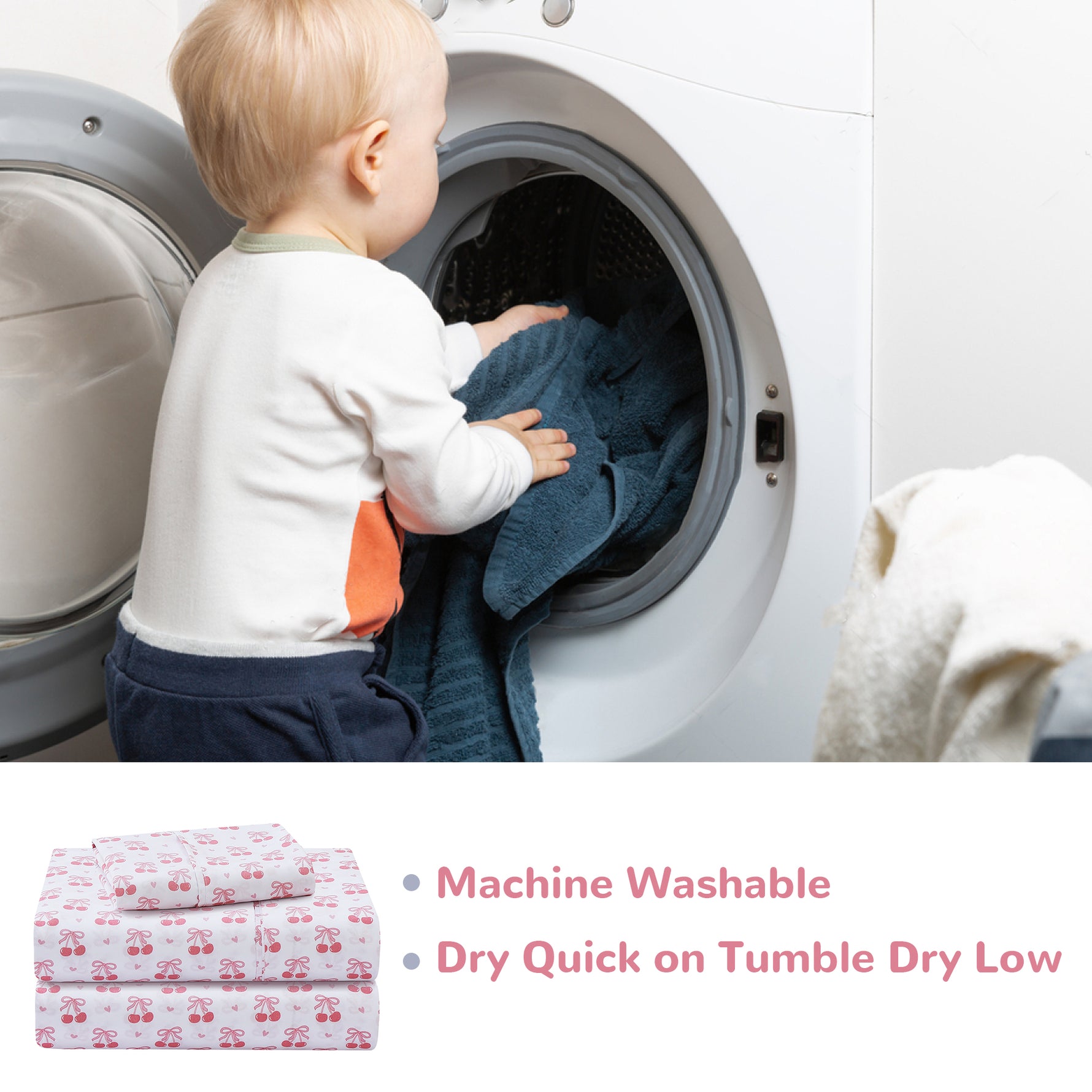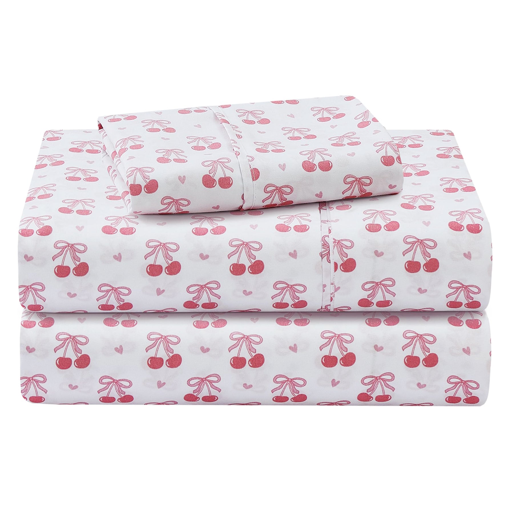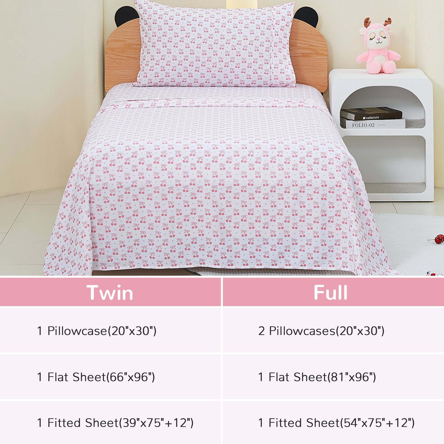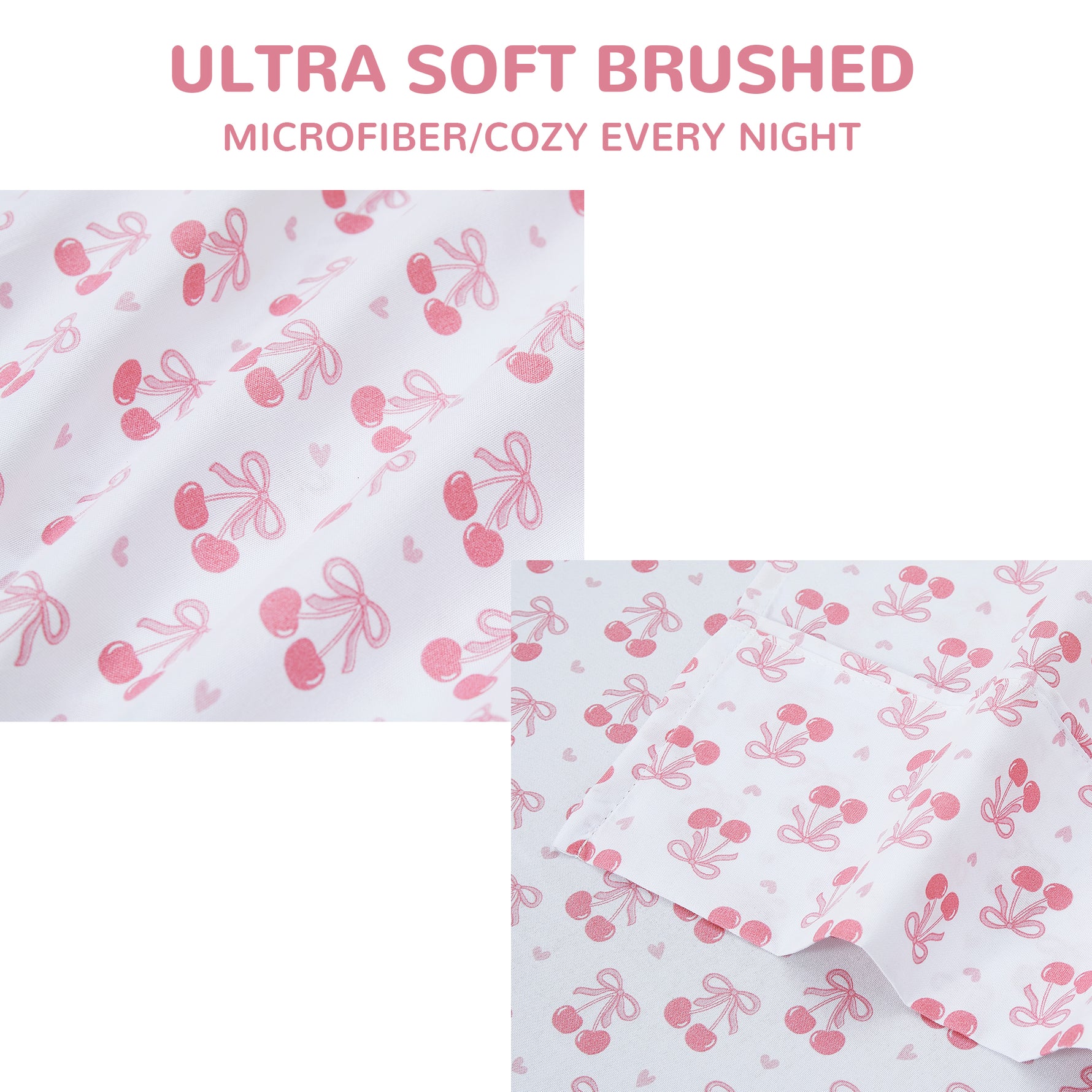 - Cozy Kids Sheet Set: We choose superior materials for kids pink sheet set - Upgraded double brushed microfiber, more soft and comfortable than normal polyester sheets. Brushed microfiber kids sheet is also breathable, wrinkle resistant and long lasting, keeping kids girls cozy night after night. Our pink with cherry bow pattern kids sheet and pillowcase set (fitted sheet included) is a good solution for kids girls single bed