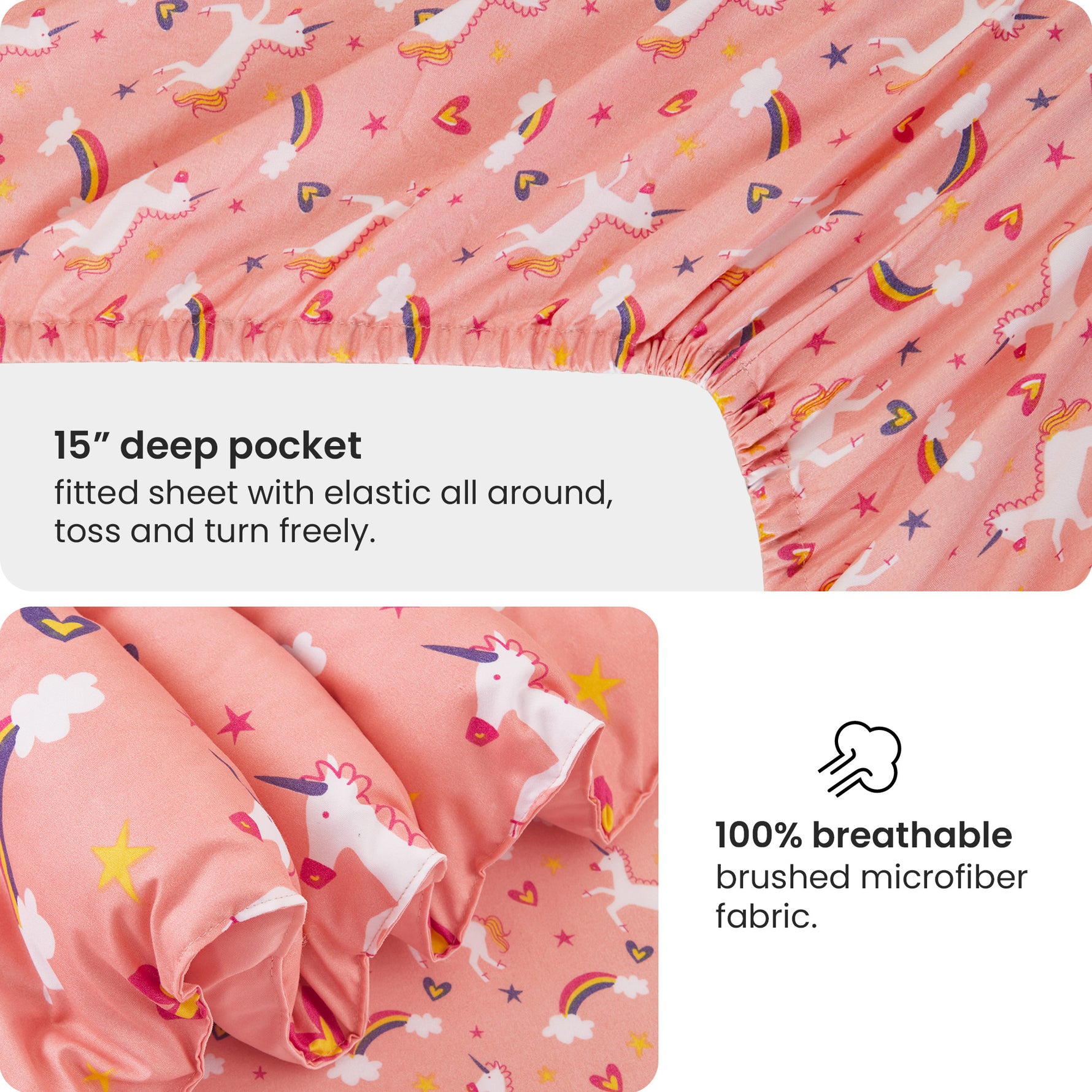 - 6 Pcs Girls Twin Bedding Set: Includes 1 comforter (68"x86"), 1 flat sheet (66"x96"+4"), 1 fitted sheet (39"x75"+15"), 1 envelop pillowcase (20"x30"), 1 pillow sham (20"x26"+2") and 1 decorative toy pillow.