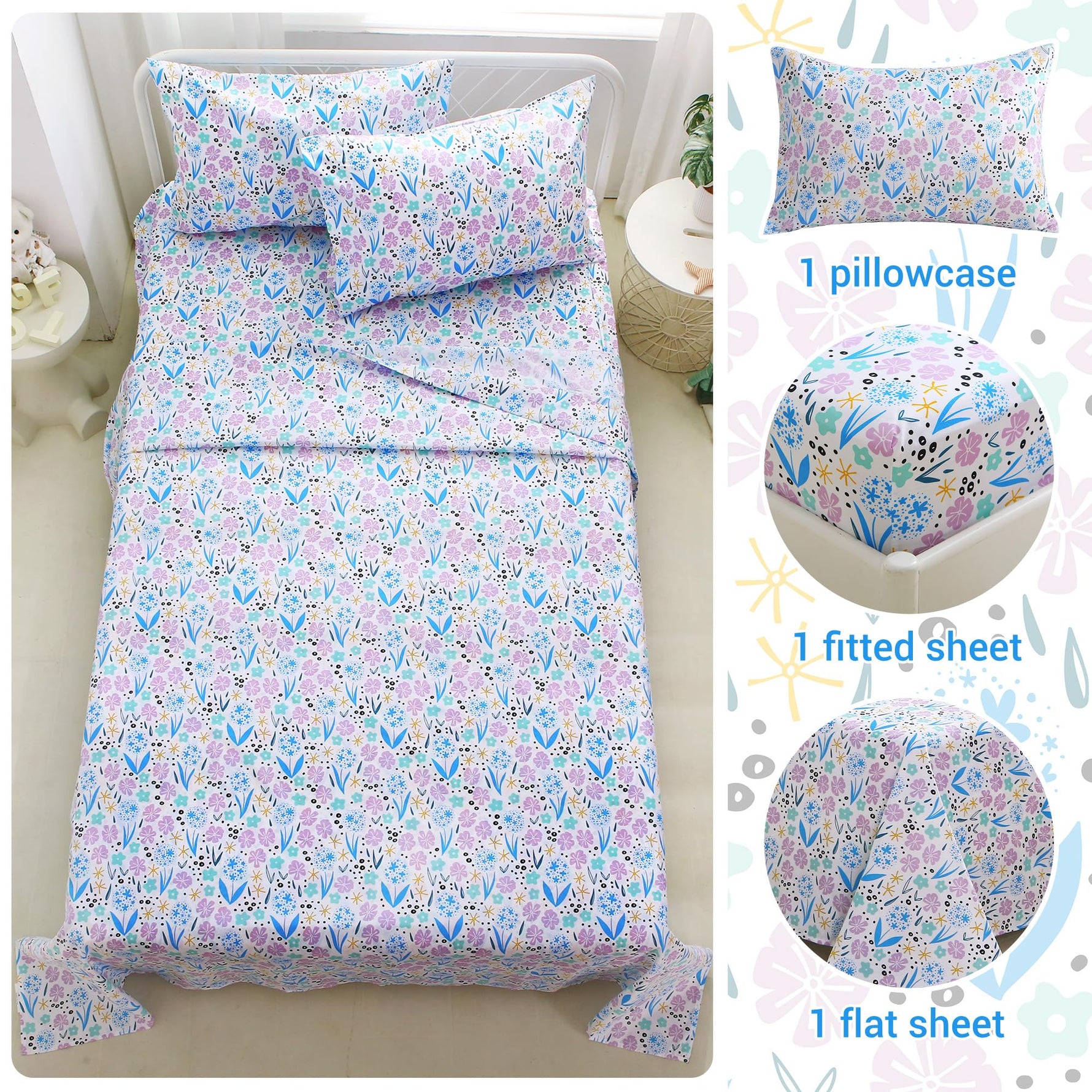 Twin Size Sheet Set: 3-piece kids twin sheet set includes 1 flat sheet 66"×96", 1 fitted sheet 39"×75" with a 15 inches deep pocket and 1 pillowcase 20"×30". 15 inches deep-pocket fitted sheet with elastic all around - make sure this kids sheet and pillowcase set fits well with kid's twin single bed
