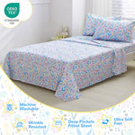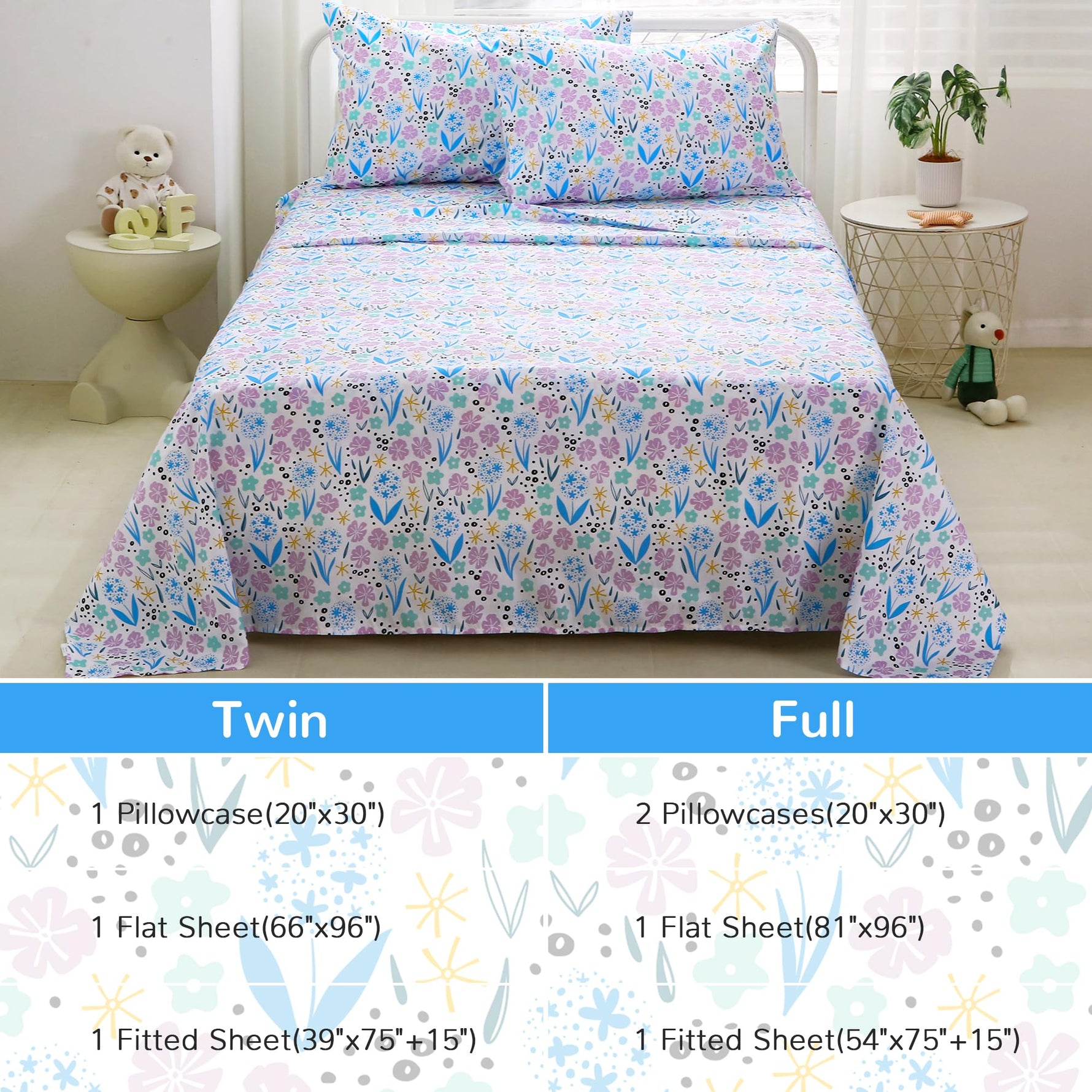 Full Size Sheet Set: 4-piece kids full sheet set includes 1 flat sheet 81"×96", 1 fitted sheet 54"×75" with a 14 inches deep pocket and 2 pillowcases 20"×30". 14 inches Deep-pocket fitted sheet with elastic all around-make sure this kids sheet and pillowcase set fits well