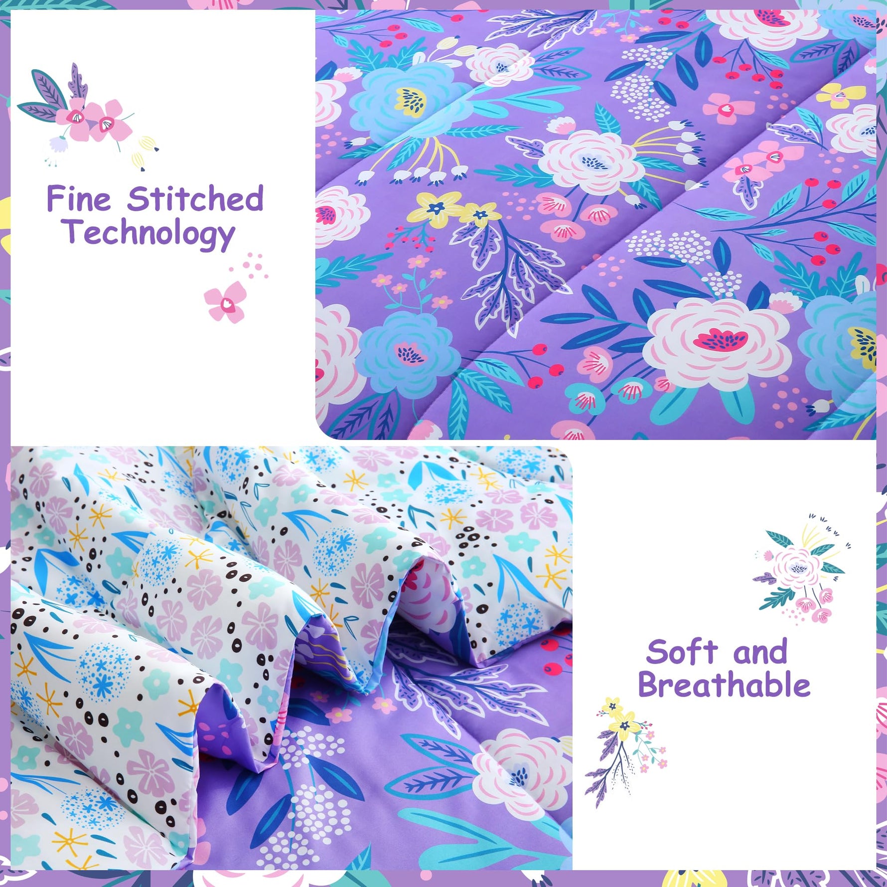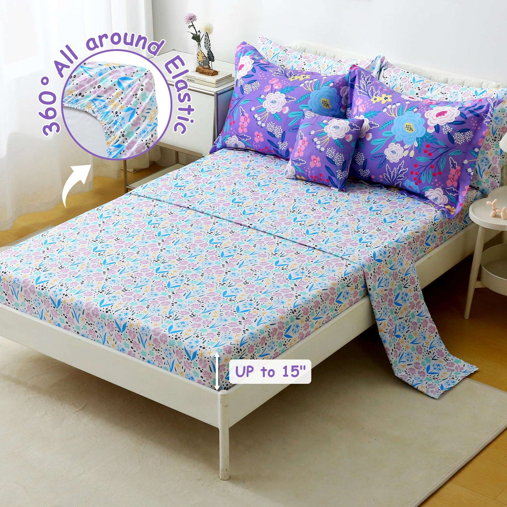 8 Pcs Girls Full Bedding Set: Includes 1 comforter (76"x86"), 1 flat sheet (81"x96"+4"), 1 fitted sheet (54"x75"+15"), 2 envelop pillowcases (20"x30"), 2 pillow shams (20"x26"+2") and 1 decorative toy pillow. The bedding comforter set for girls keeps it fits the body effectively.