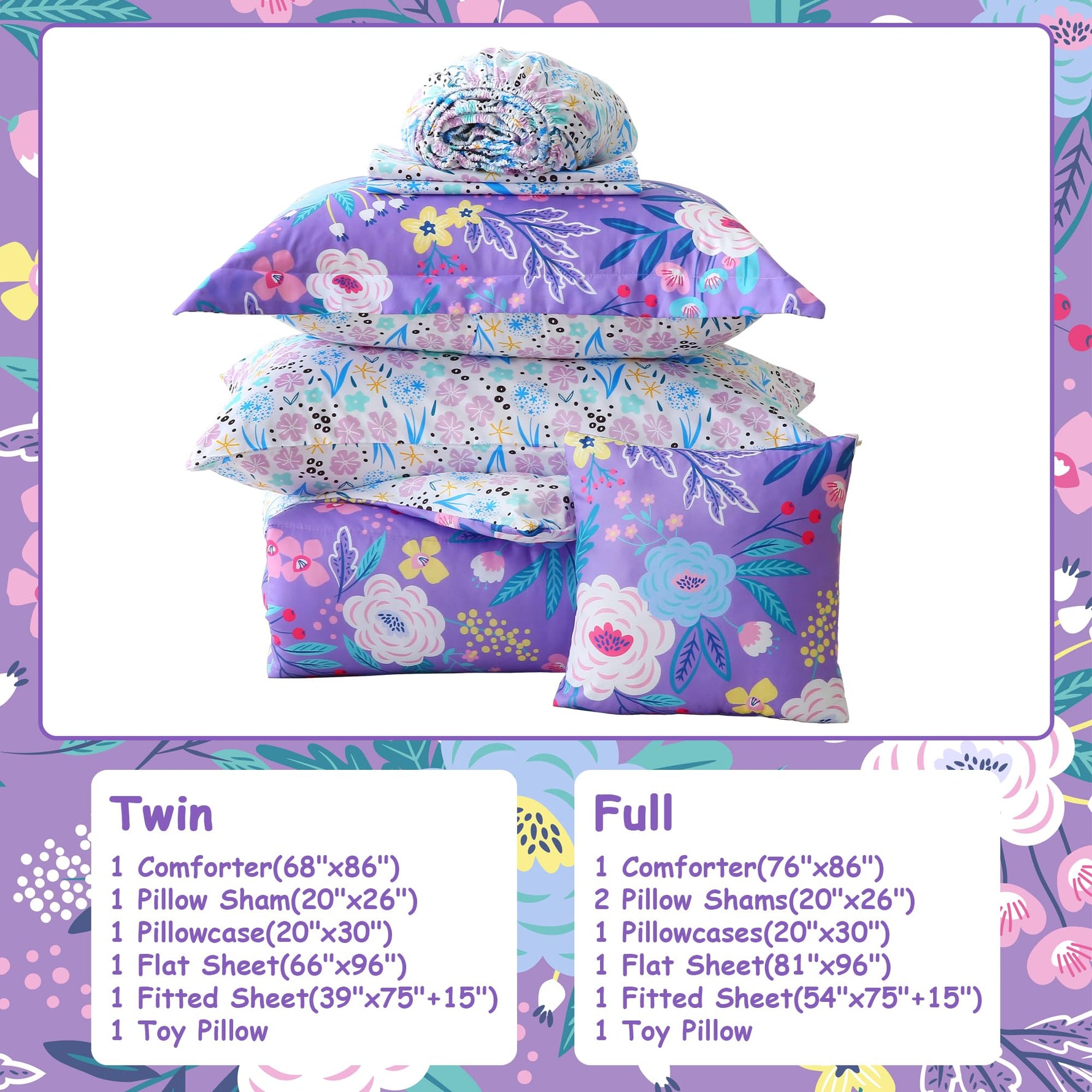 6 Pcs Girls Twin Bedding Set: Includes 1 comforter (68"x86"), 1 flat sheet (66"x96"+4"), 1 fitted sheet (39"x75"+15"), 1 envelop pillowcase (20"x30"), 1 pillow sham (20"x26"+2") and 1 decorative toy pillow.