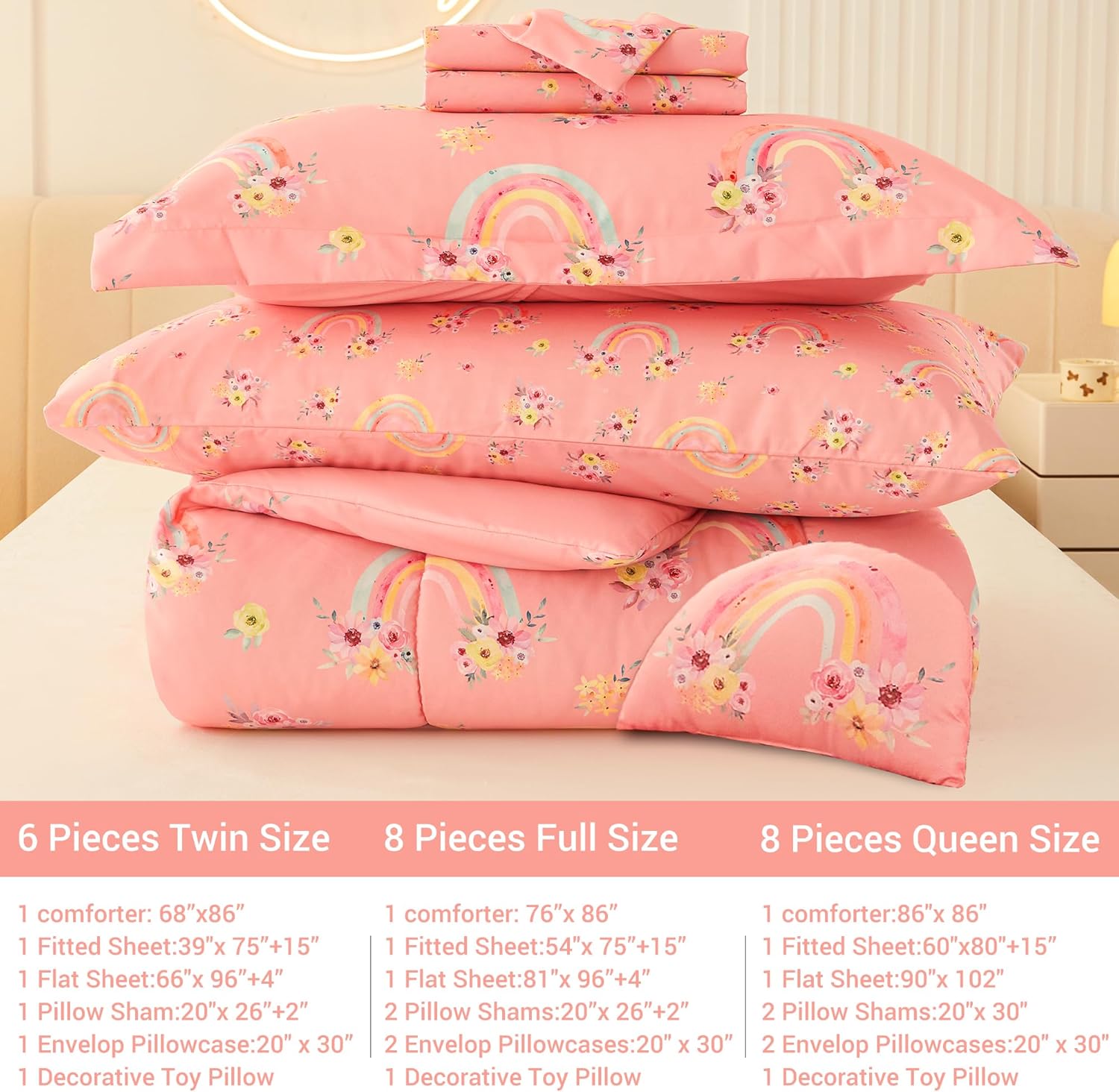 - 8 Pcs Girls Full Bedding Set: Includes 1 comforter (76"x86"), 1 flat sheet (81"x96"+4"), 1 fitted sheet (54"x75"+15"), 2 envelop pillowcases (20"x30"), 2 pillow shams (20"x26"+2") and 1 decorative toy pillow. The bedding comforter set for girls keeps it fits the body effectively.