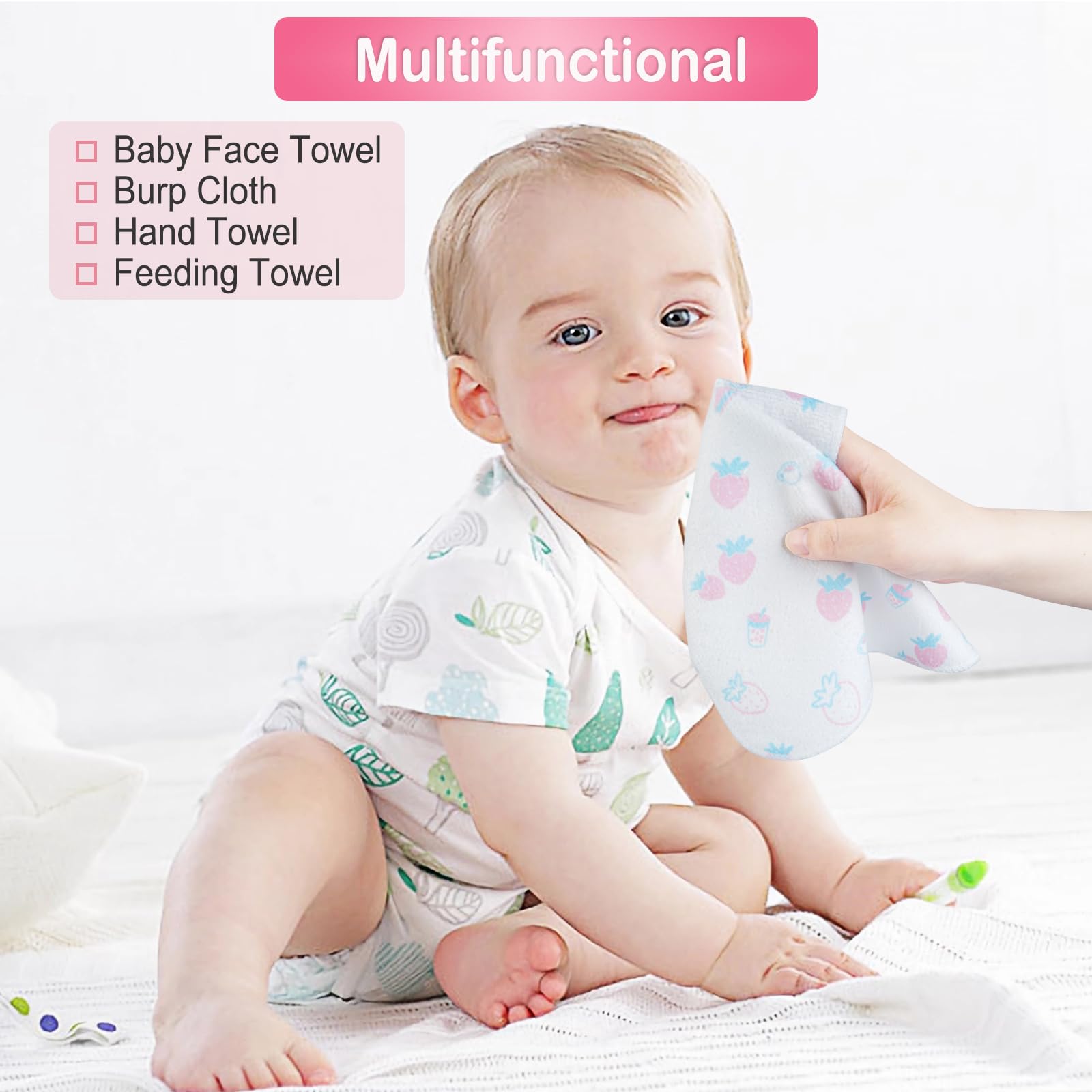 • 【Ultra Soft】Baby washcloths made of ultra-soft towel fabric, perfect for babies, sensitive skin, and those that suffer from other skin. Finely crafted with premium polyester threads that are woven for long-lasting strength without sacrificing softness.
