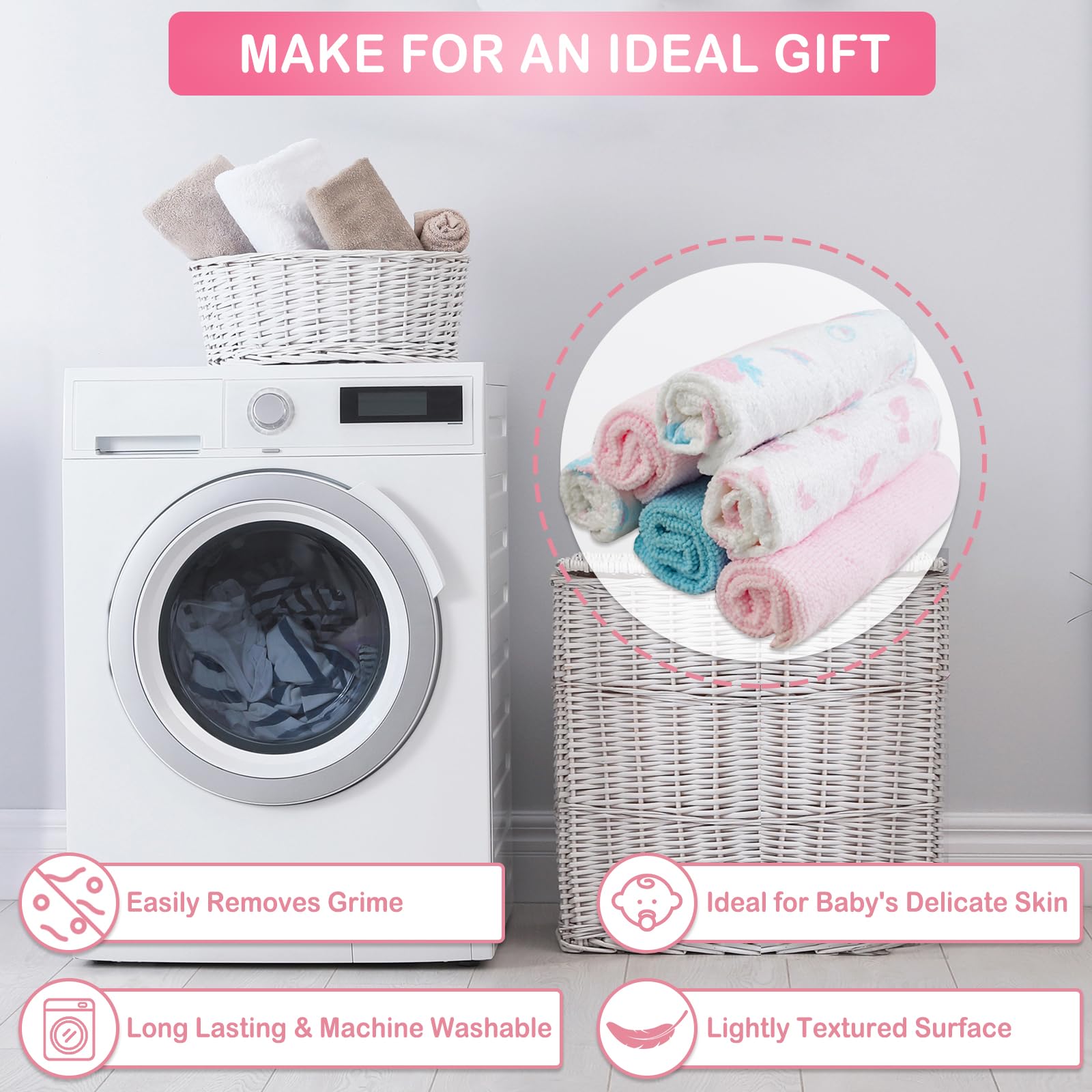 • 【Perfect 24pcs baby washcloths】24pcs 9''x9'' baby wash cloths fit from newborn to toddler(0-6 years). Our baby washcloths are soft and breathable, and gentle on baby's skin. The cute animal design comes in soothing pink, blue and gray colors making it a great parent choice for boys and girls alike.