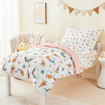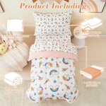Toddler Comforter Set Include: 1 comforter (42"x57"), 1 toddler flat sheet (45"x60"), 1 toddler fitted sheet (28"x52"+8"), and 1 pillowcase (20"x30") included for this 4 pieces toddler bed in a bag,which is specifically designed to fit standard US crib/toddler mattress sizes
