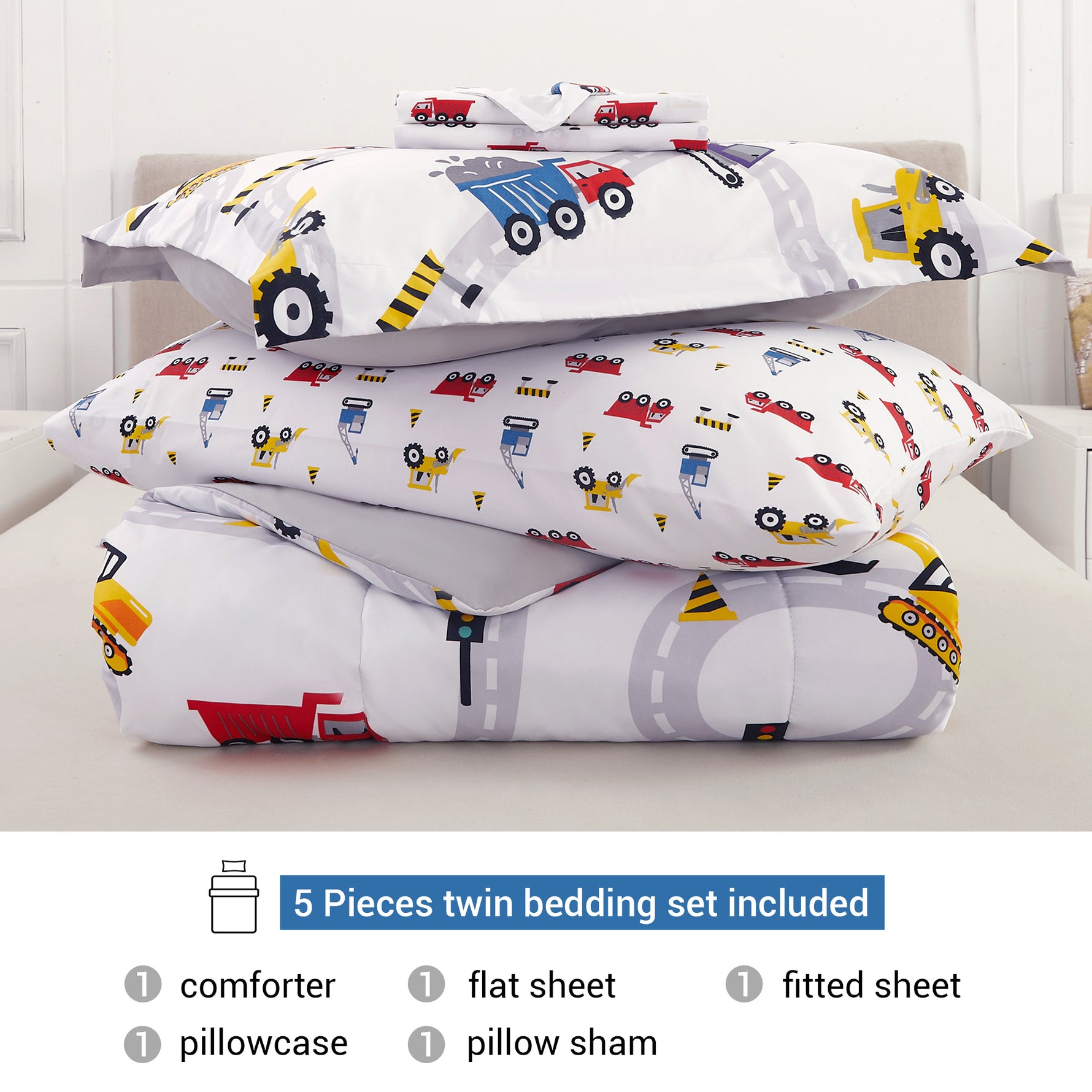 ---Twin size boys bed in a bag with unique excavator car pattern includes 1 comforter (68"x86"), 1 flat sheet (66"x96"), 1 fitted sheet (39"x75"+15"), 1 pillowcase (20"x30") and 1 pillow sham (20"x26");